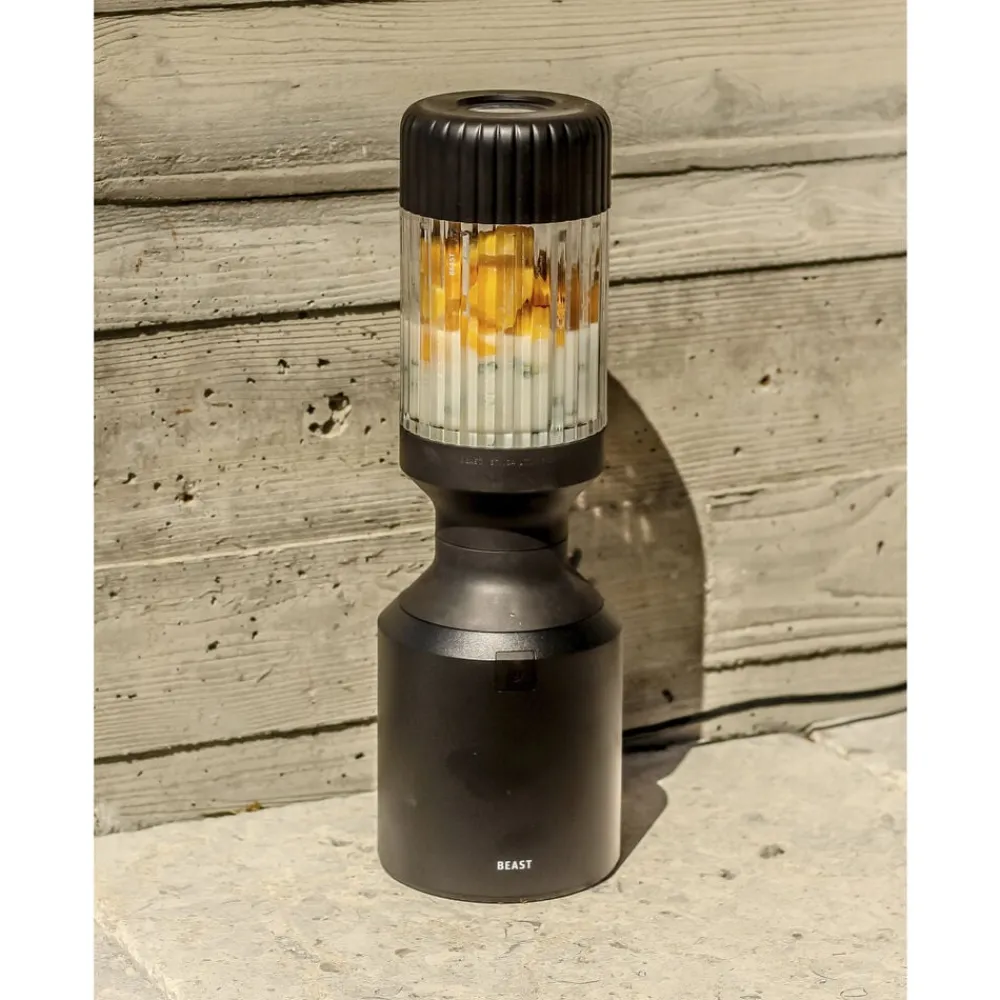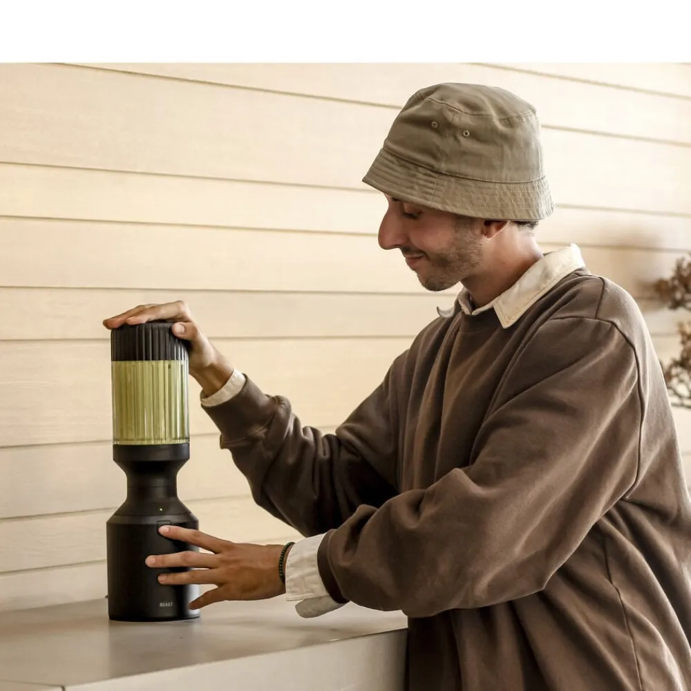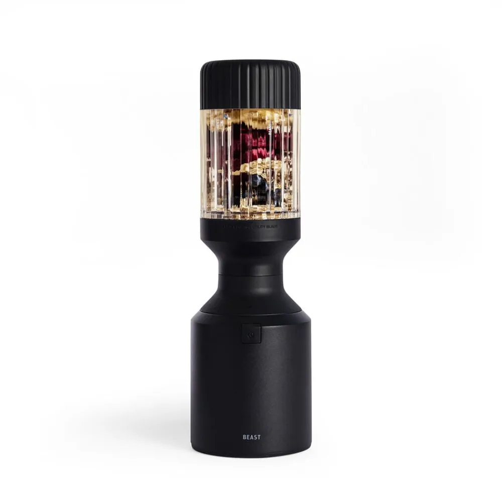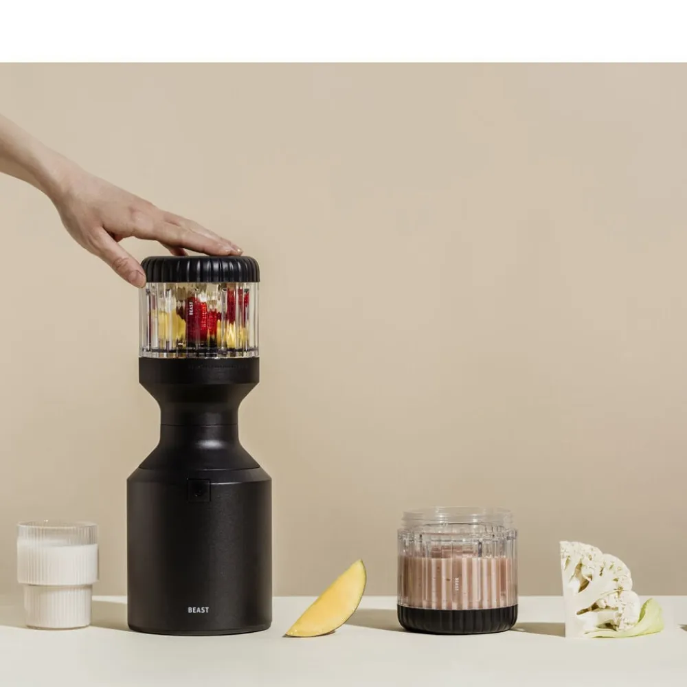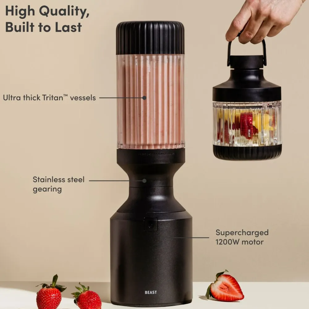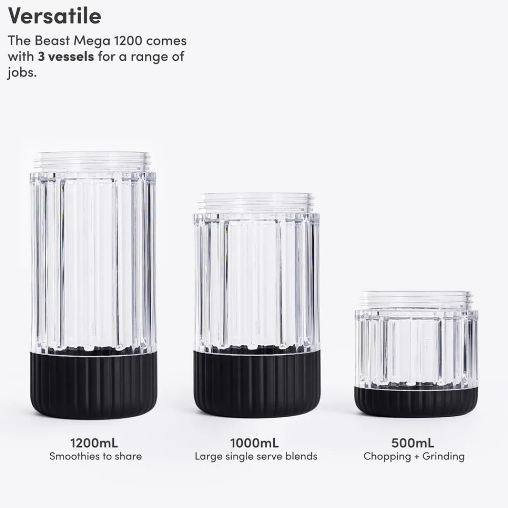 Beast Mega Plus 1200 leveres med tre blenderbeholdere (500, 1000 og 1200 ml), der fungerer som drikkebeholdere, når du sætter drikkelåg og sugerørshætte på og tager dem med dig på farten. Den rillede beholder giver dig et godt greb.
