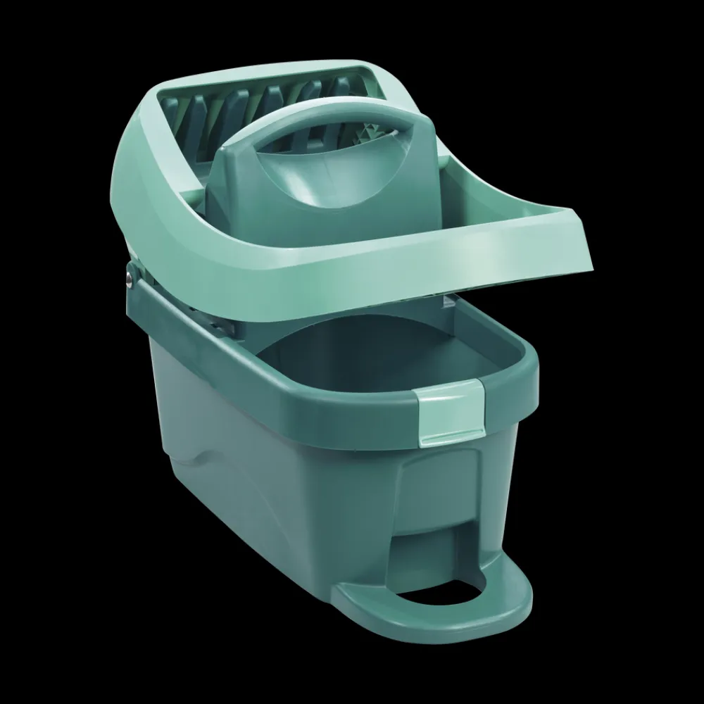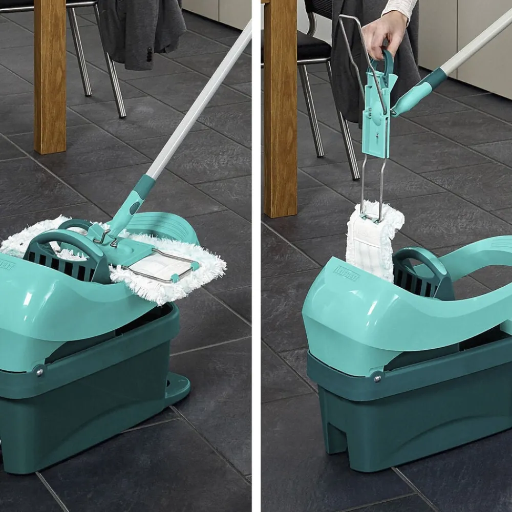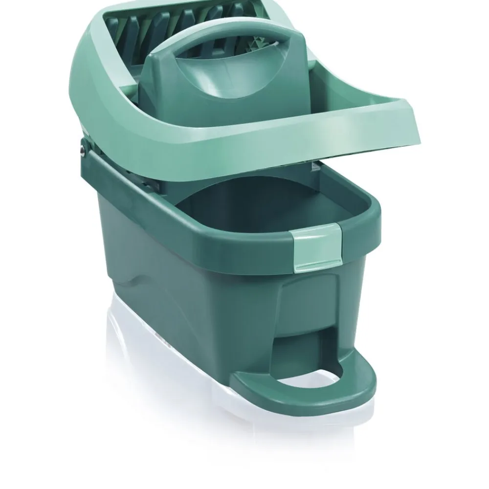 Med Profi XL Mobile gulvspand med vridesystem bliver gulvvasken hurtigere og samtidig mere skånsom for både hænder og ryg. Du behøver hverken at få hænderne i vand eller at bukke dig ned. Du løsner bare kluden fra fladmoppens holder med et hurtigt tryk med foden, dypper kluden i spanden og placerer den i vrideren, som du også betjener med foden, og klikker den på plads i holderen. Lige så effektivt, som hvis du vred kluden med hænderne.