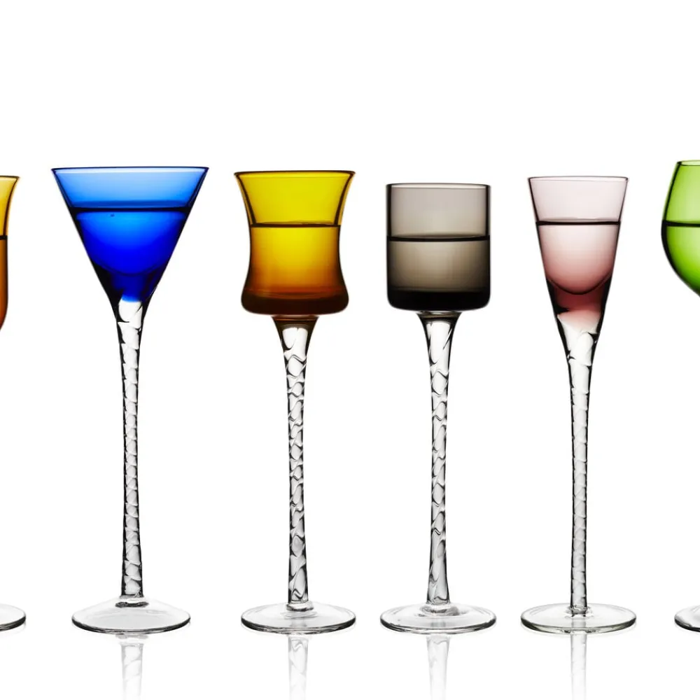6 forskellige gennemfarvede, mundblæste snapseglas med snoet stilk bidrager til en god stemning ved bordet, og det er nemt at finde sit eget glas. Snapseglassene har forskellige udformninger i farverne lilla, blå, smoke, amber, grøn og gul og indeholder fra 2,5 op til 5 cl. H 18 cm.