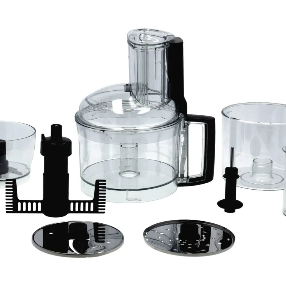 Magimix-sættet består af: 3 skåle, 1 låg, 2 nedstoppere, 1 x 2 mm snitteskive, 1 x 2 mm riveskive, 1 minikniv, 1 æggepisker og 1 aksel.