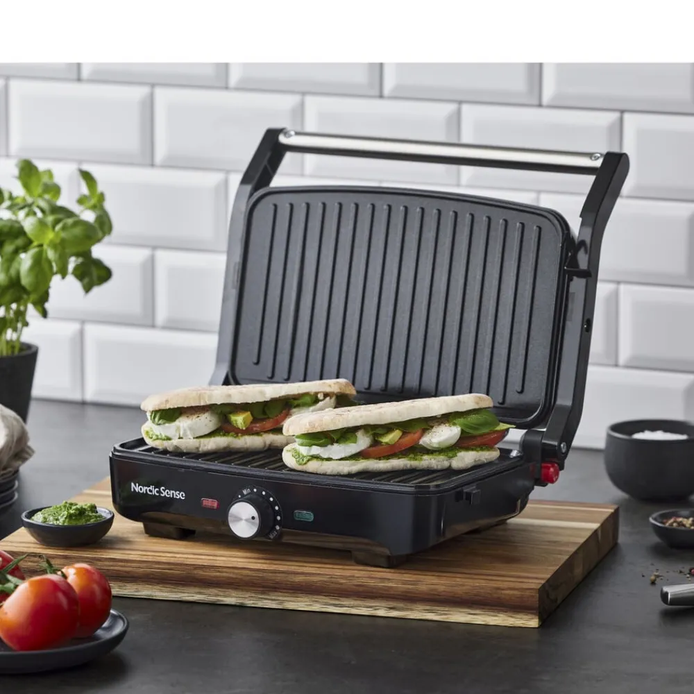 Paninigrill på 1600 watt – gør det nemt at lave sprøde og lækre paninier eller grillede sandwich. Grillpladerne har keramisk belægning, og den justerbare temperatur giver fuld kontrol over tilberedningen, så du opnår perfekte resultater. Grillen kan åbnes 180° og bruges som bordgrill. Indikatorlys viser, når den er tændt og klar til brug, mens den aftagelige drypbakke opsamler overskydende fedt.