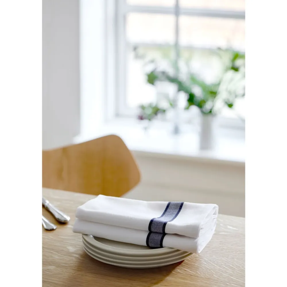 Stofserviet fremstillet i 100 % bomuld. Det klassiske hvide stof kombineret med en enkel farvet stribe giver mulighed for et let og personligt udtryk. Servietten er blød, behagelig og nem at folde, så du kan variere udtrykket, når borddækningen skal have lidt ekstra opmærksomhed.