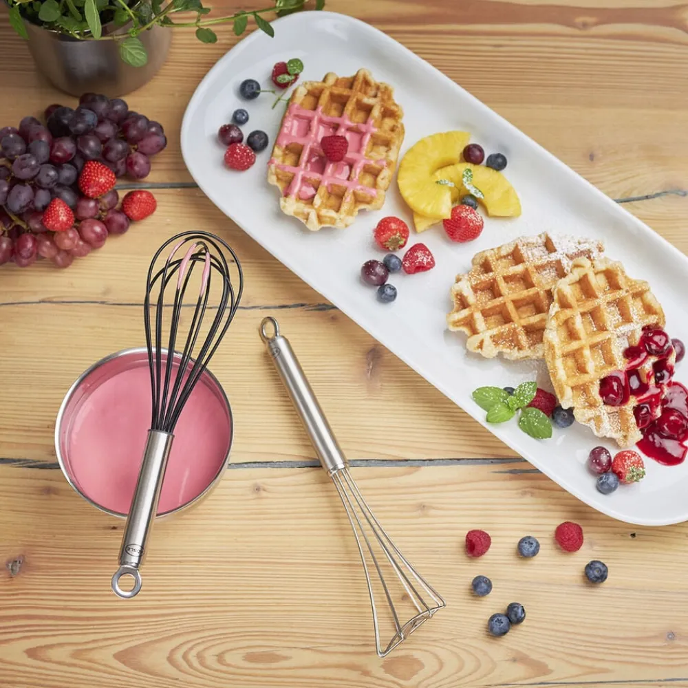Piskeriset med den særlige skrå form er ideelt, når du ønsker en luftig dej, fx pandekage- og vaffeldej, eller pisker æggehvider til marengs og lignende. Piskeriset når ud i alle hjørner af gryden eller skålen, også langs kanten i bunden.