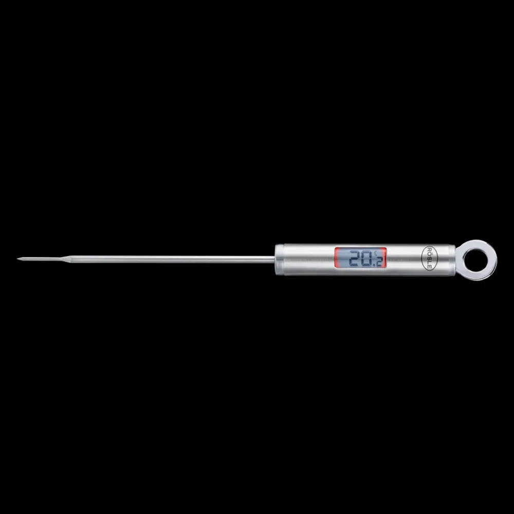 RÖSLE gourmettermometer har et digitalt display, der måler fra -40 °C til +200 °C. Til hurtig og nem måling af temperaturen i mange forskellige fødevarer – lige fra stegen til babymad, vin eller te. Tåler ikke opvaskemaskine. Bruger 2 x LR44 knapcellebatterier (medfølger ikke).