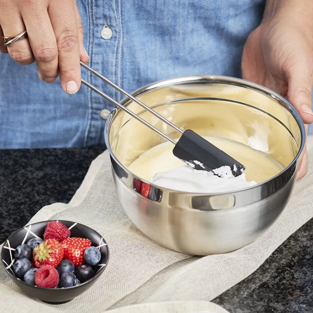 RÖSLE dejskraber med slidstærk silikone klarer temperaturer fra -30 °C til +230 °C samt fedtstoffer, olie m.m. Den fleksible side af silikonebladet tilpasser sig skålens form, mens den hårdere side er perfekt til at udglatte. Tåler opvaskemaskine.