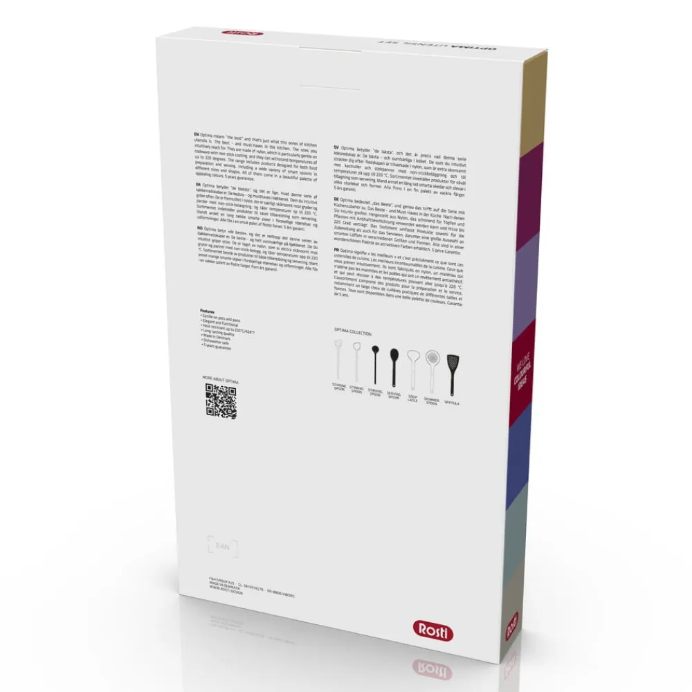Optima betyder “de bedste”, og det er lige, hvad denne serie af køkkenredskaber er. De bedste – og musthaves i køkkenet. Dem du intuitivt griber efter. De er fremstillet i nylon, der er særligt skånsomt mod gryder og pander med non-stick-belægning, og tåler temperaturer op til 220 °C. Sortimentet indeholder produkter til såvel tilberedning som servering, blandt andet en lang række smarte skeer i forskellige størrelser og udformninger. Alle fås i en smuk palet af flotte farver. 5 års garanti.