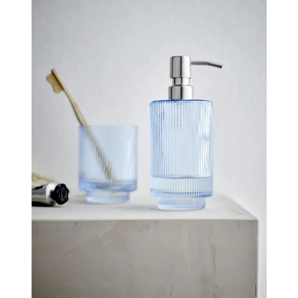 Clarity sæbedispenseren og tandbørsteholderen er lavet af riflet glas med et diskret bølgemønster. Den slanke silhuet giver et cool og elegant look.