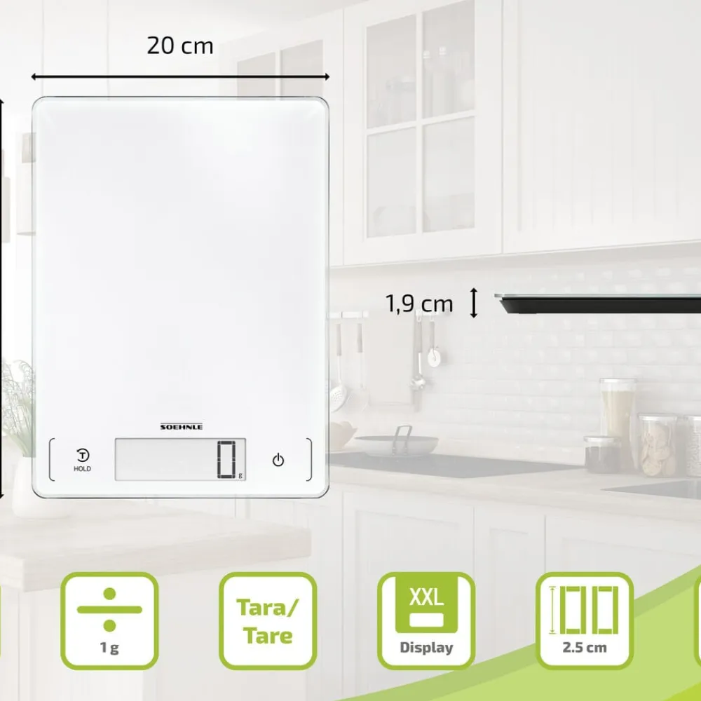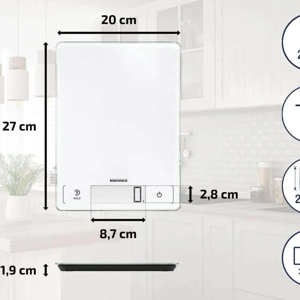 Page Profi 300 er en køkkenvægt i kompakt design med en ekstra stor overflade, som giver god plads til skåle og fade. Med en måleflade på 27 x 20 cm og en kapacitet på op til 20 kg er vægten perfekt til både små og store opgaver. Vægten har et letlæseligt display, tarafunktion og automatisk sluk, så du sparer på batteriet. Enhederne kan nemt skiftes mellem g/kg og oz/lb efter behov. Den glatte overflade i sikkerhedsglas er hurtig at rengøre og vægten kan nemt hænges op, når den ikke er i brug.