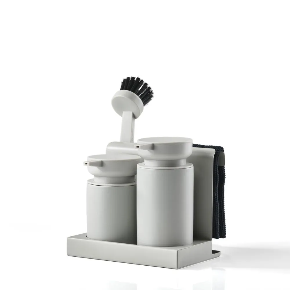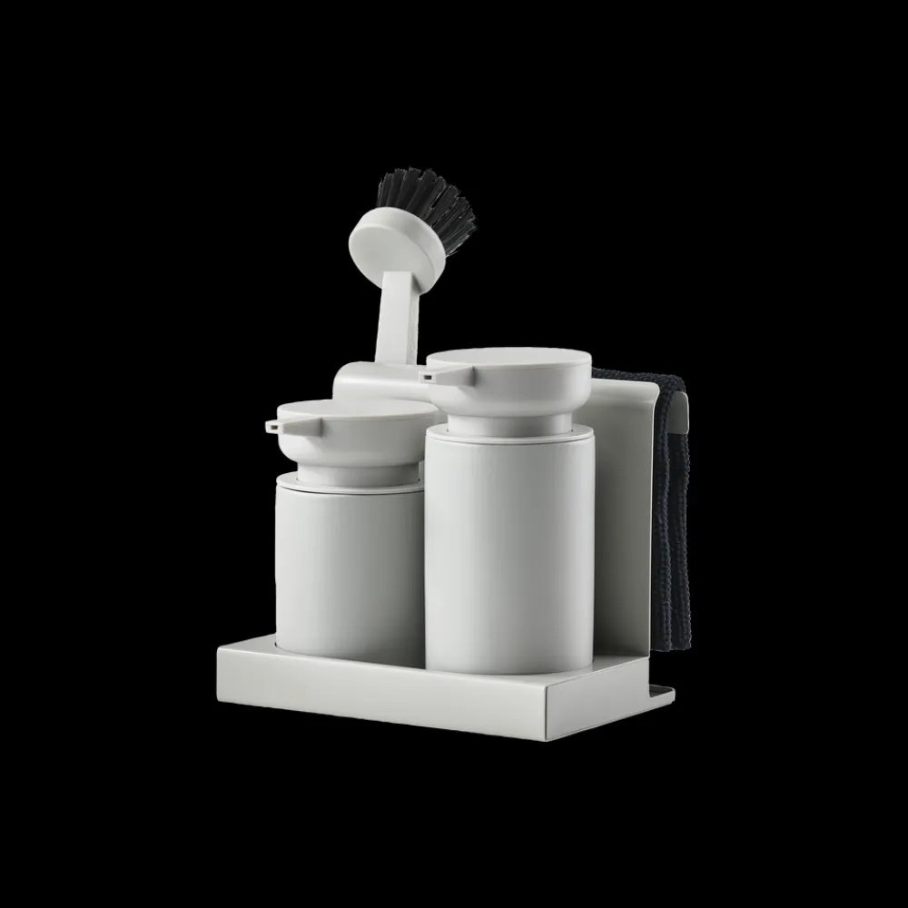 I front står dispenser-duoen til opvaskemiddel og håndsæbe/sprit. Begge dele er udført i keramik. Backstage hænger den strikkede karklud til tørre ganske uset, til den skal i brug. Den får selskab af børsten i matchende farve. En sidste fiks detalje er den lille bundbakke, der opsamler overskydende vand, så det ikke ender på køkkenbordet.