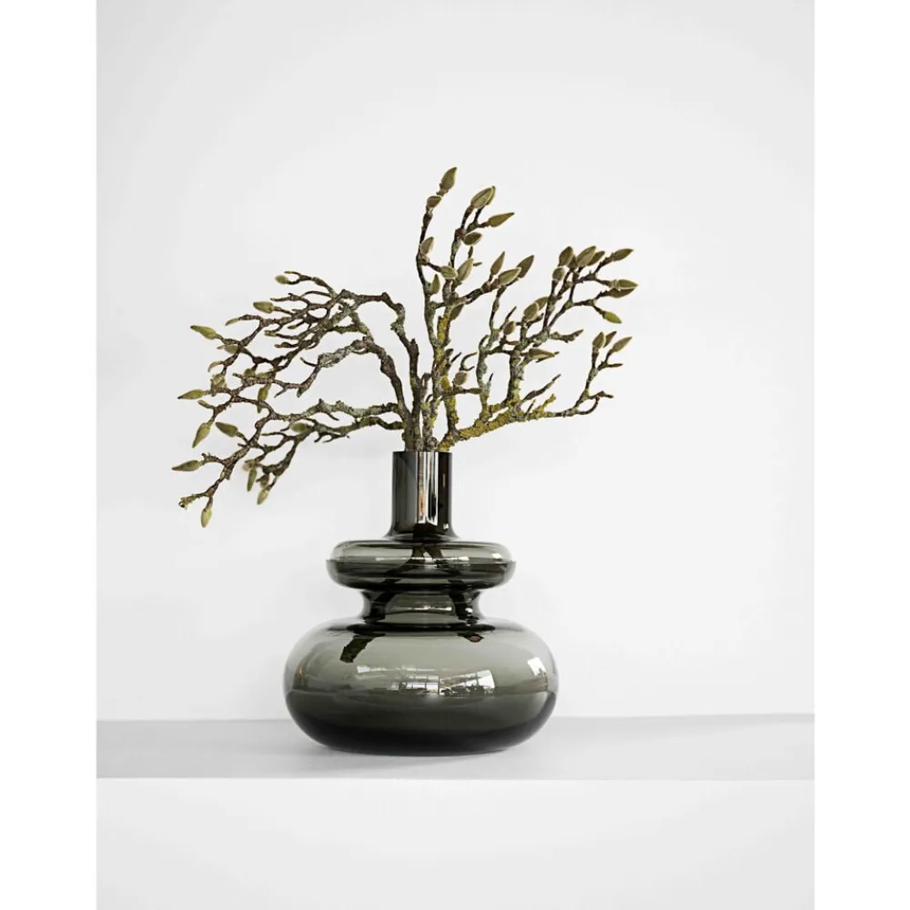 Vasen består af to dele, hvor topstykket kan vendes. Vender du halsen nedad, er vasen den perfekte base for høje buketter. Vender du halsen opad, støtter den elegant op om nogle få grene eller enkelte stilke. Fjerner du topstykket helt, har du en smuk organisk omfavnelse af store tætte buketter.