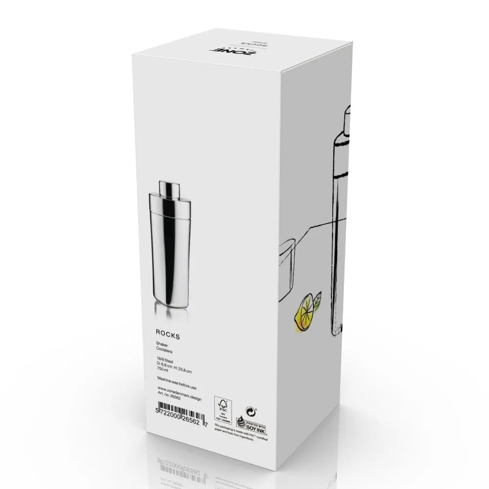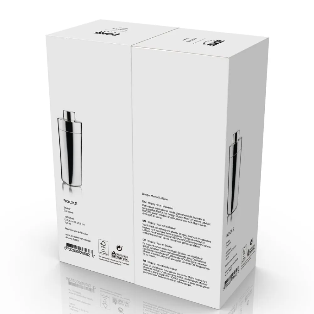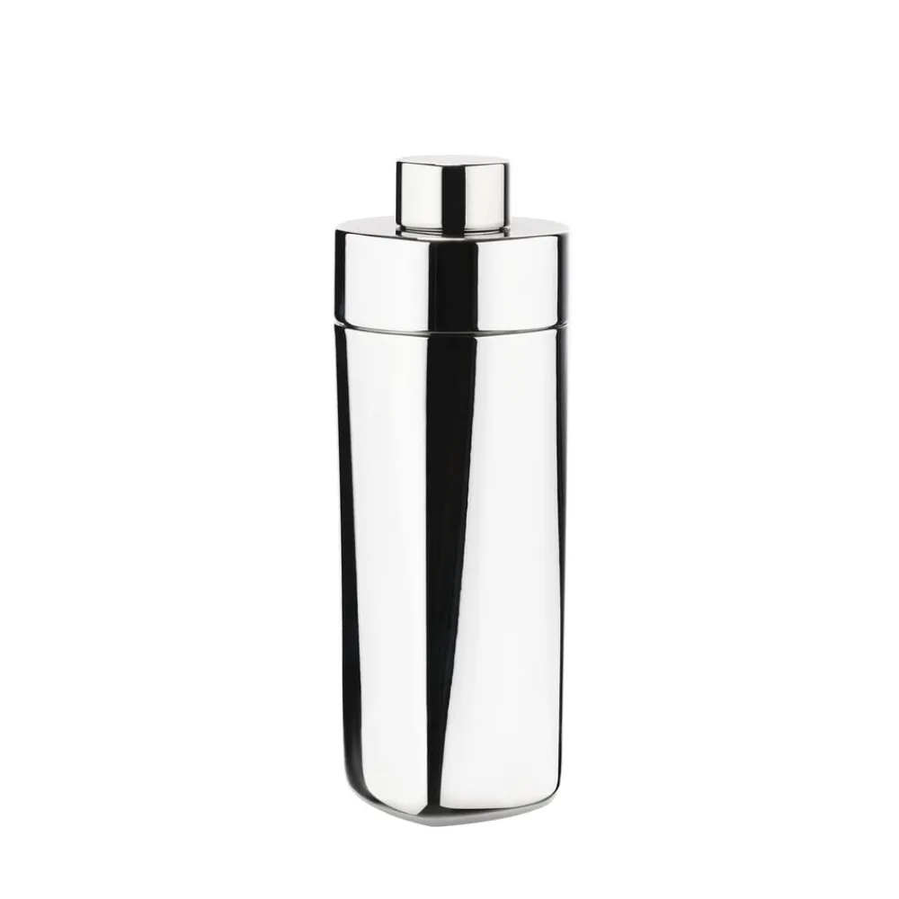 Shaker designet af Mavro//Lefèvre med inspiration fra en smeltende isternings på en gang skarpe og bløde former. Shakeren er udført i spejlblankt, rustfrist stål og har indbygget filter under låget. H 23,2 cm. 0,4 l.