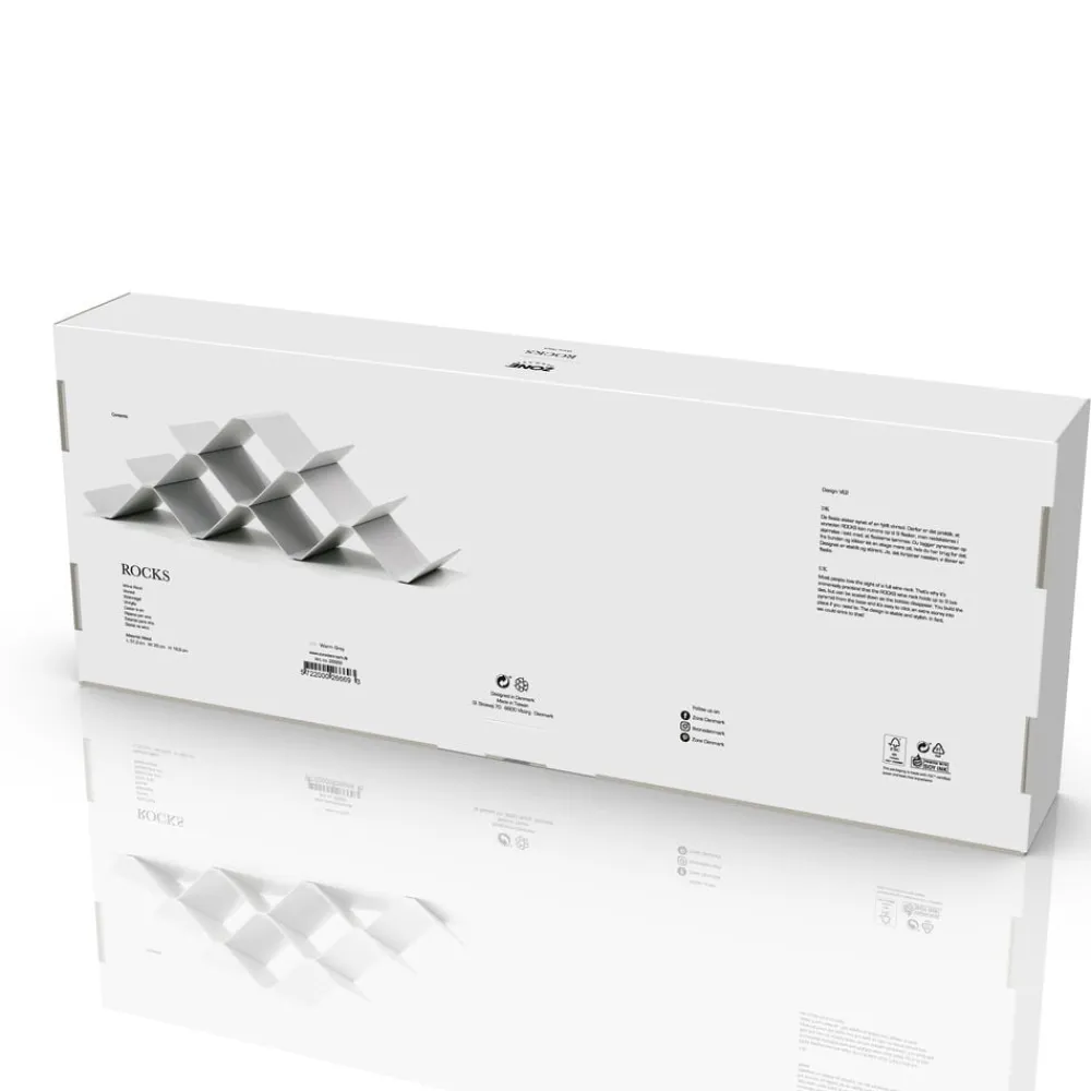 Stilrent og stabilt design. De fleste elsker synet af en fyldt vinreol. Derfor er det praktisk, at vinreolen Rocks kan rumme op til 9 flasker, men nedskaleres i størrelse i takt med, at flaskerne tømmes. Pyramiden bygges op fra bunden, og du kan nemt klikke en etage mere på, hvis du får brug for det.