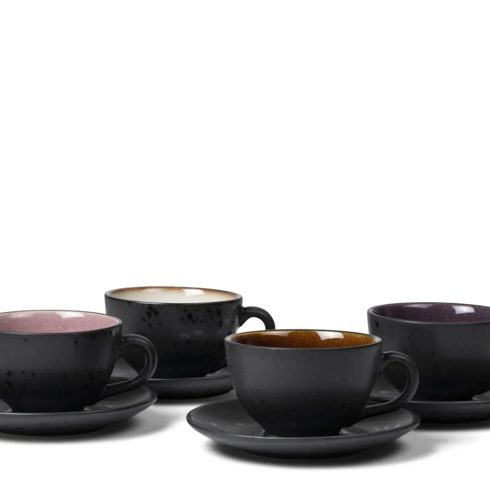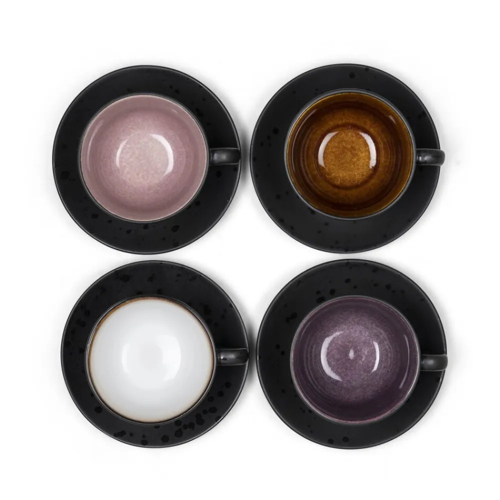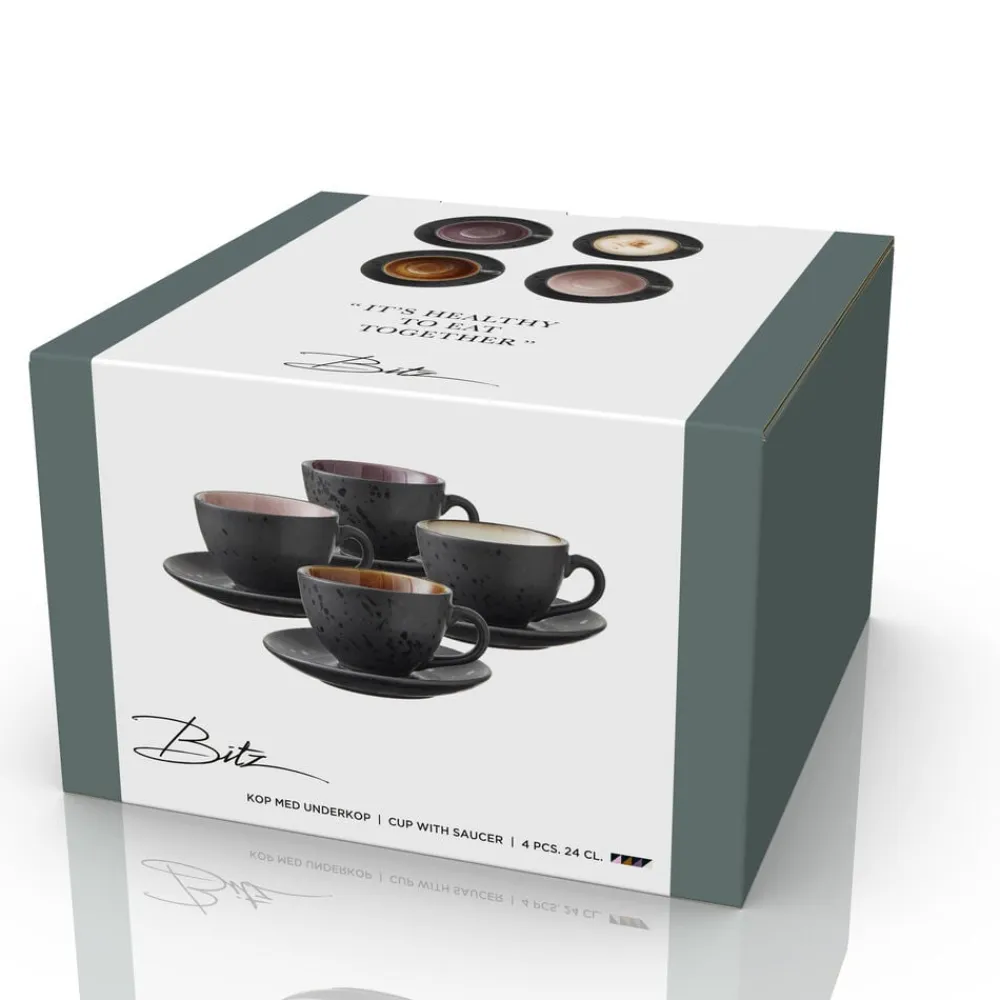 4 stk. Nyd din cappuccino og dine andre kaffefavoritter i den flotte BITZ Kop med underkop. Fremstillet i mat, sort stentøj med blank glasur i amber, lyserød, lilla, creme på koppens inderside. 24 cl, 6 cm høj. Velegnet til maskinopvask, mikroovn og ovn op til 220 gr.