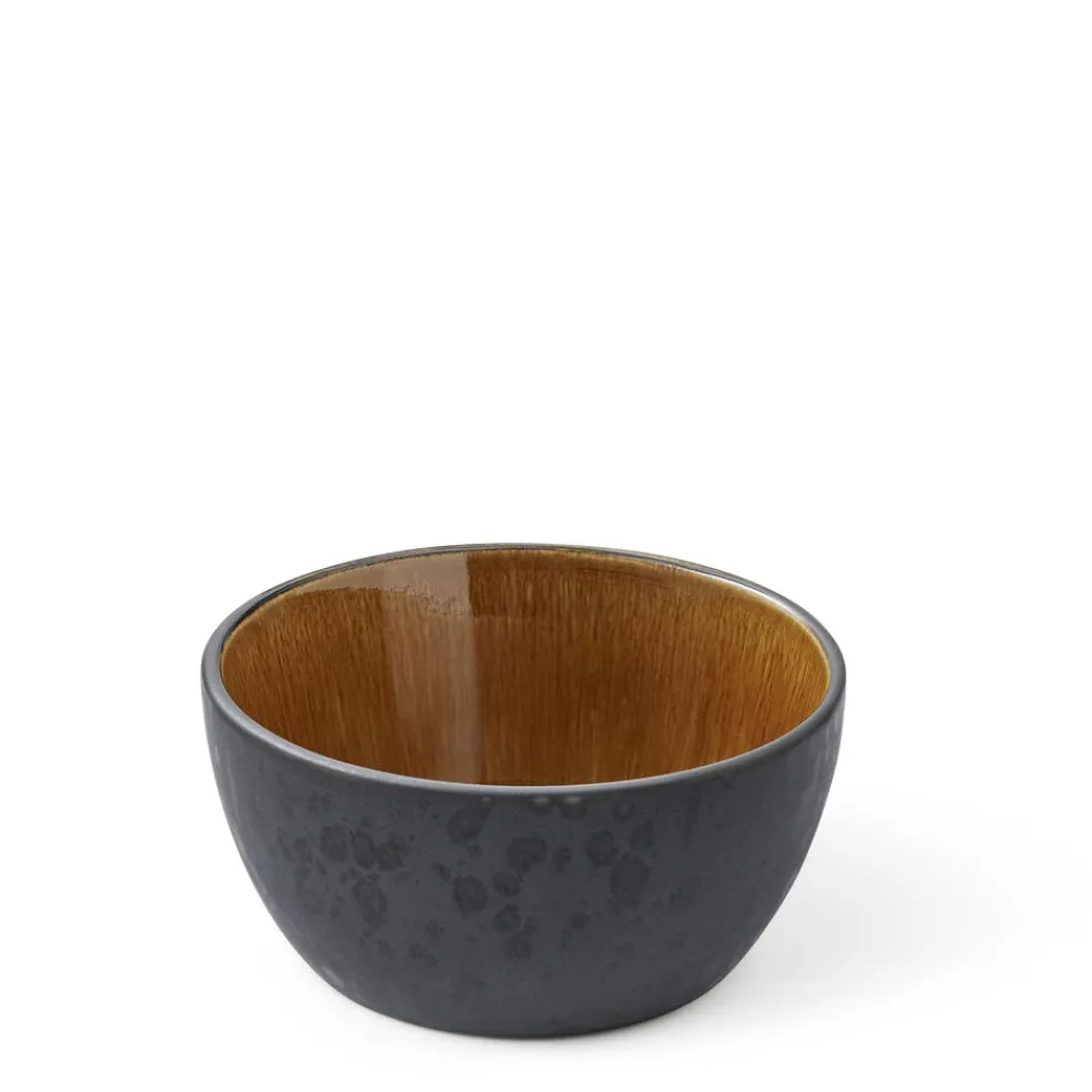 BITZ Skål i stentøj med mat sort glasur udenpå og blank amberfarvet inderside. 10 cm i diameter, højde 5 cm, en størrelse med uendelige anvendelsesmuligheder, brug den fx til oliven, nødder og snacks, dip og dressing, chokolader, bær og frugtstykker.
