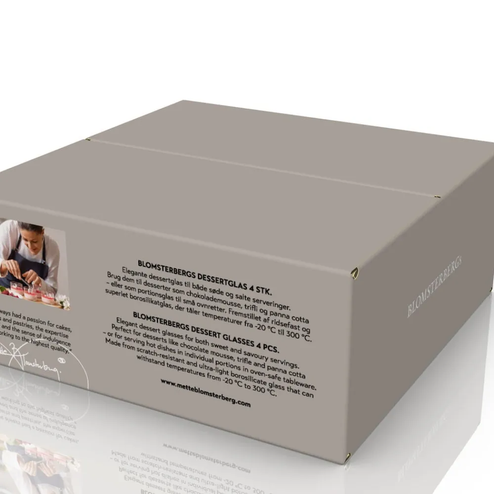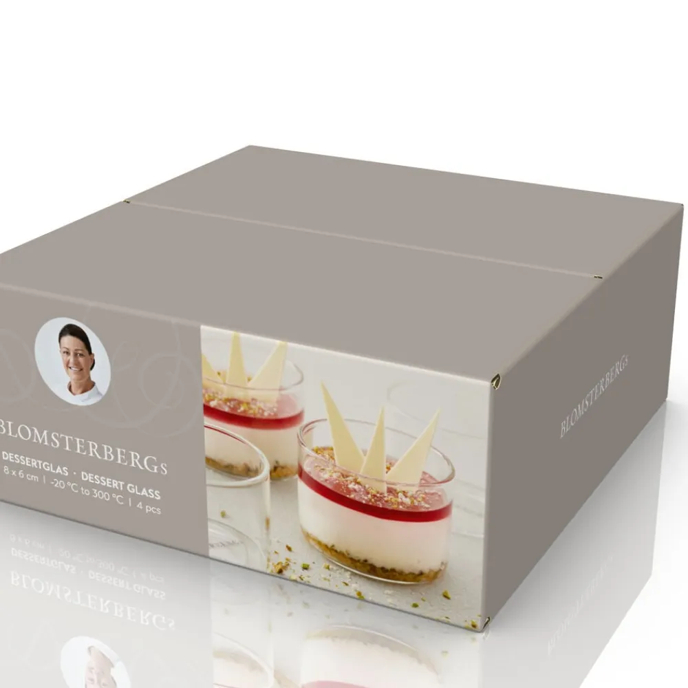 Elegante dessertglas til alle mulige små, lækre anretninger i det søde og i det salte køkken – mousse, is, trifli, kartoffelmos, souffle m.v. Glassene er fremstillet af borosilikatglas, der er ridsefast, meget let og tåler ekstreme temperaturer fra -20 °C og op til 300 °C. Derfor kan du tilberede direkte i glasset. Velegnet til opvaskemaskine. Dia. 8 cm x H 6 cm.