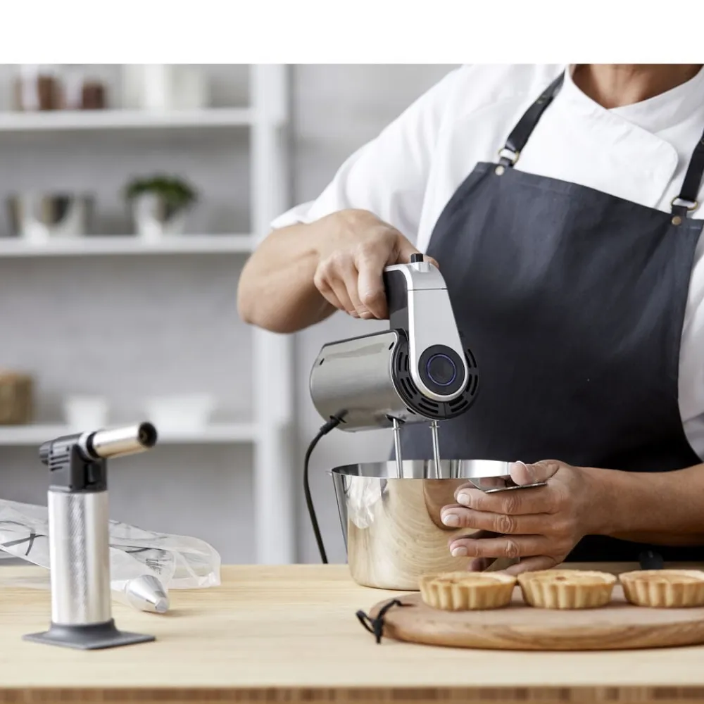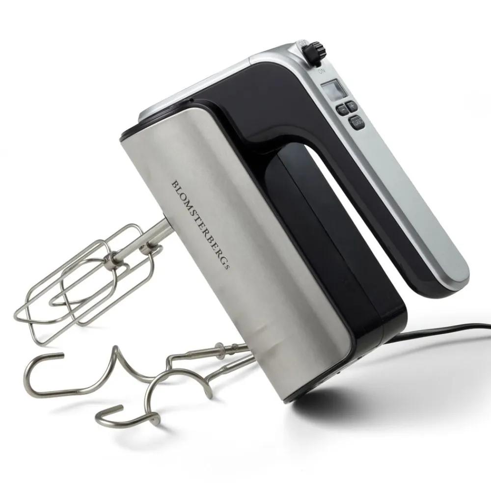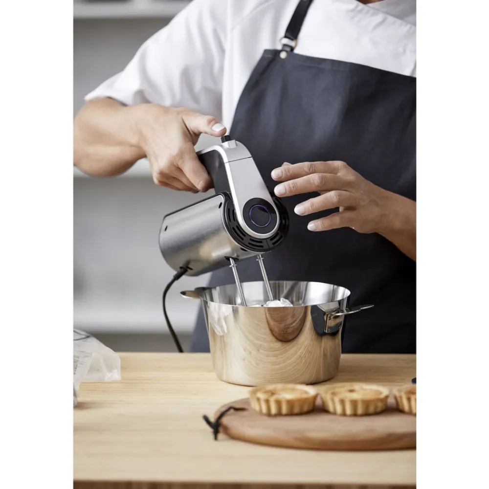 Håndmikser i kompakt design i sort plastik og rustfrit stål med blåt LED display som viser hastighed og tidsforbrug. Fem hastigheder med turbofunktion. 2 almindelige piskeris og 2 dejkroge medfølger. Med individuel udløserknap til piskerisene og 1,5 meter spiralledning.