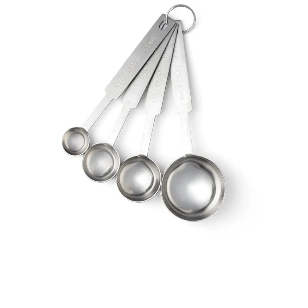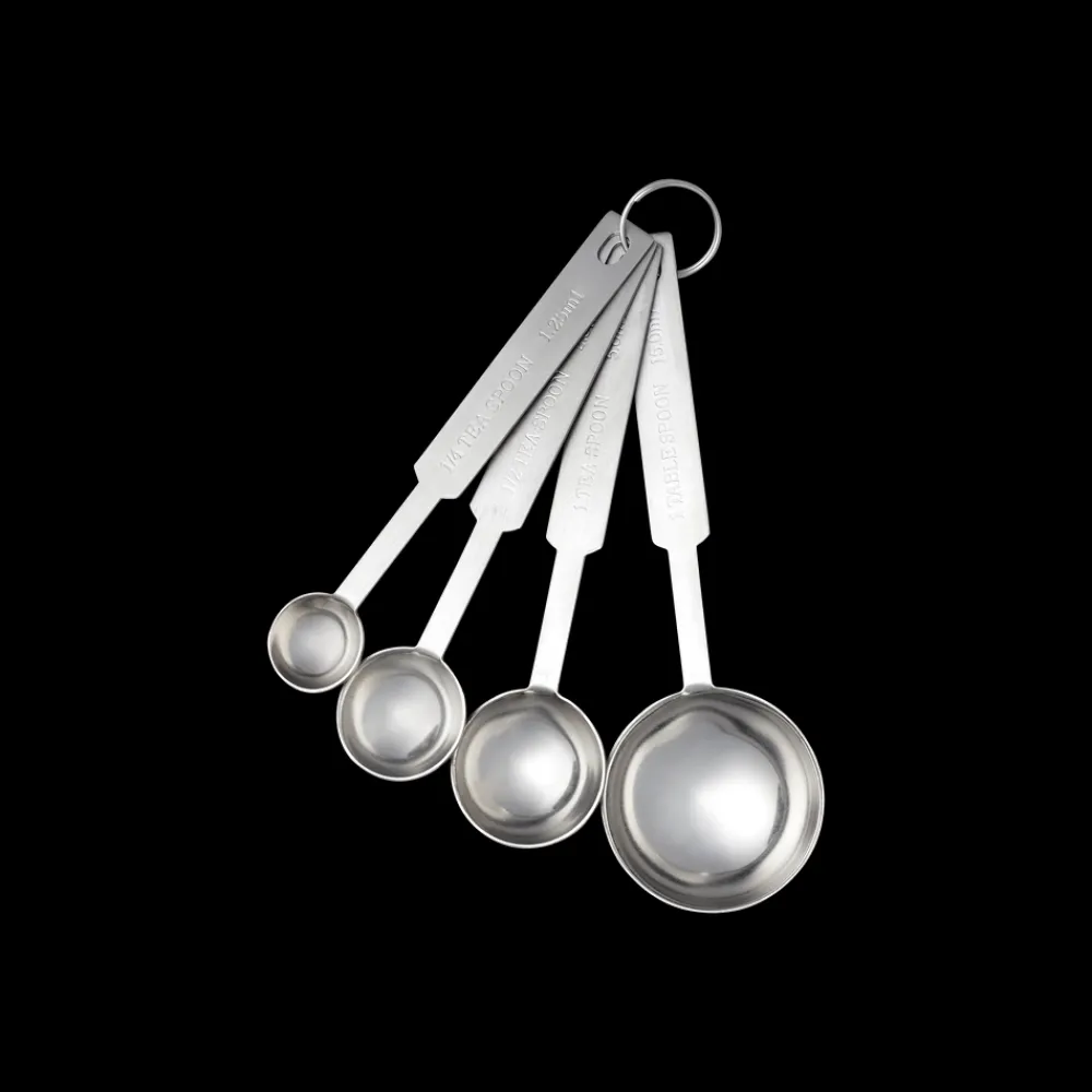 Sæt med 4 måleskeer i rustfrit stål. Skeerne rummer 1,25, 2,5, 5,0 og 15 ml, hvilket svarer til en kvart, en halv og en hel teske samt en spiseske, alle i strøgne mål. Sættet er praktisk samlet med en metalring. De er nemme at opbevare, idet skeerne passer ind i hinanden og derved fylder minimalt.