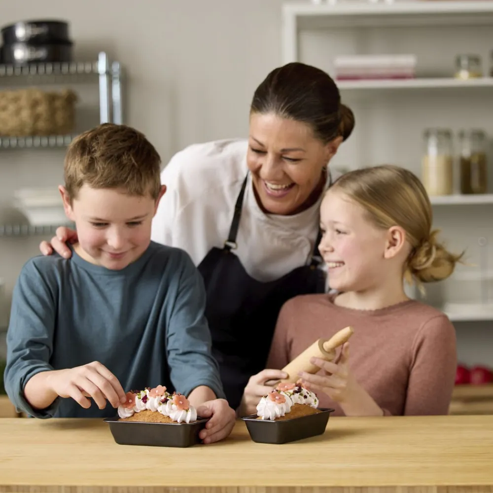 Nyd bagekunstens små glæder med et sødt bagesæt bestående af to minibrødforme på 15,5 x 8,5 x 4,5 cm og en kagerulle i FSC-certificeret bøgetræ på 22 x 4 cm. Ideelt til små udgaver af dine foretrukne kage- og brødopskrifter og egner sig godt til bageentusiaster i alle aldre. Uanset om du lige har taget hul på dit bageeventyr eller er en erfaren mesterbager, har formene en god størrelse til at eksperimentere med nye opskrifter eller forfine de klassikere, du allerede elsker. Formene er fremstillet i carbonstål med non-stick-belægning, som slipper nemt og er let at rengøre. Tåler ovn (maks. 220 °C) og fryser (maks. -20 °C). Vaskes med varmt vand og sæbe før første brug. Håndopvask anbefales.