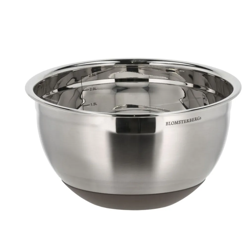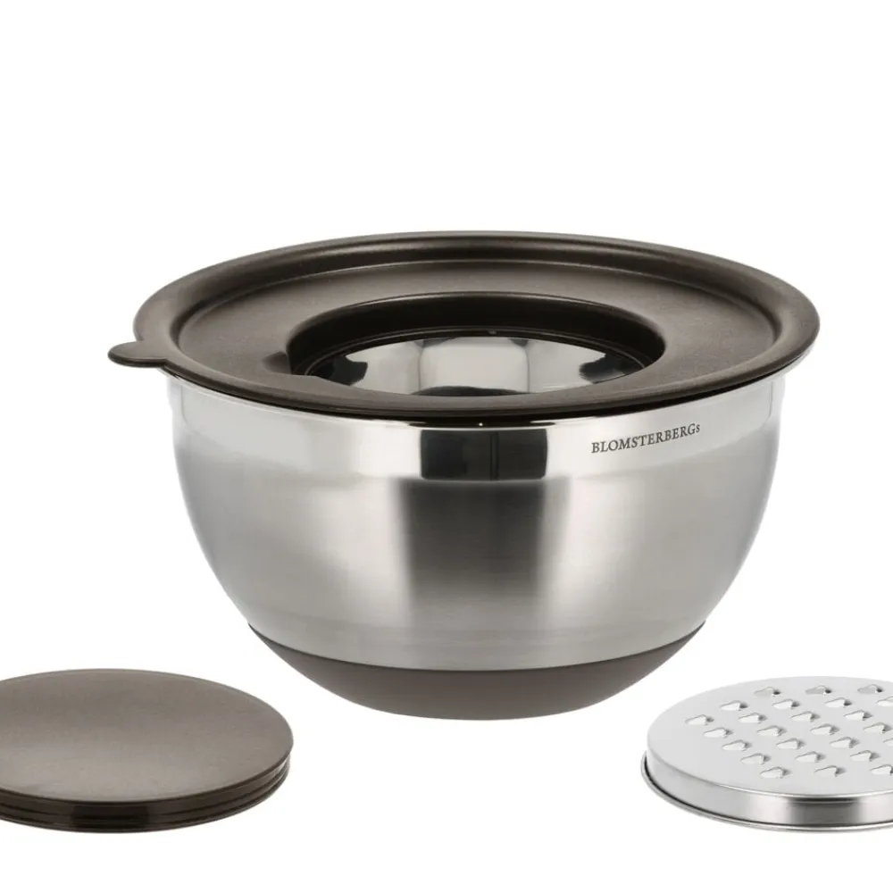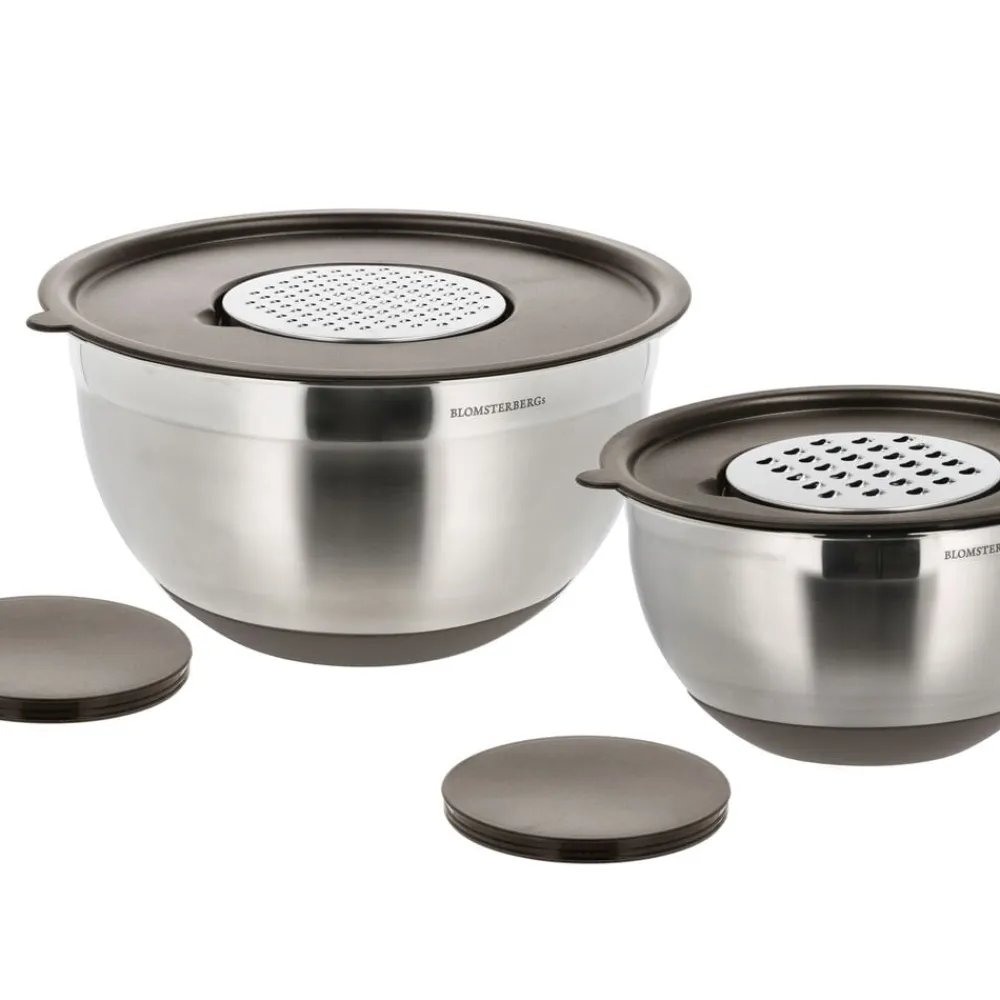 Røreskålesæt i rustfrit stål på 3 og 5 liter. Sættet har ikke bare et lækkert design, men også smarte detaljer. Skålene står solidt på bordet takket være en skridsikker, lattefarvet silikonebund, der både gør dem stabile og pæne at se på. Der medfølger også låg samt to forskellige rivejern, der nemt klikkes fast i låget. En smart løsning, når der skal rives grøntsager eller andet godt direkte ned i skålen.