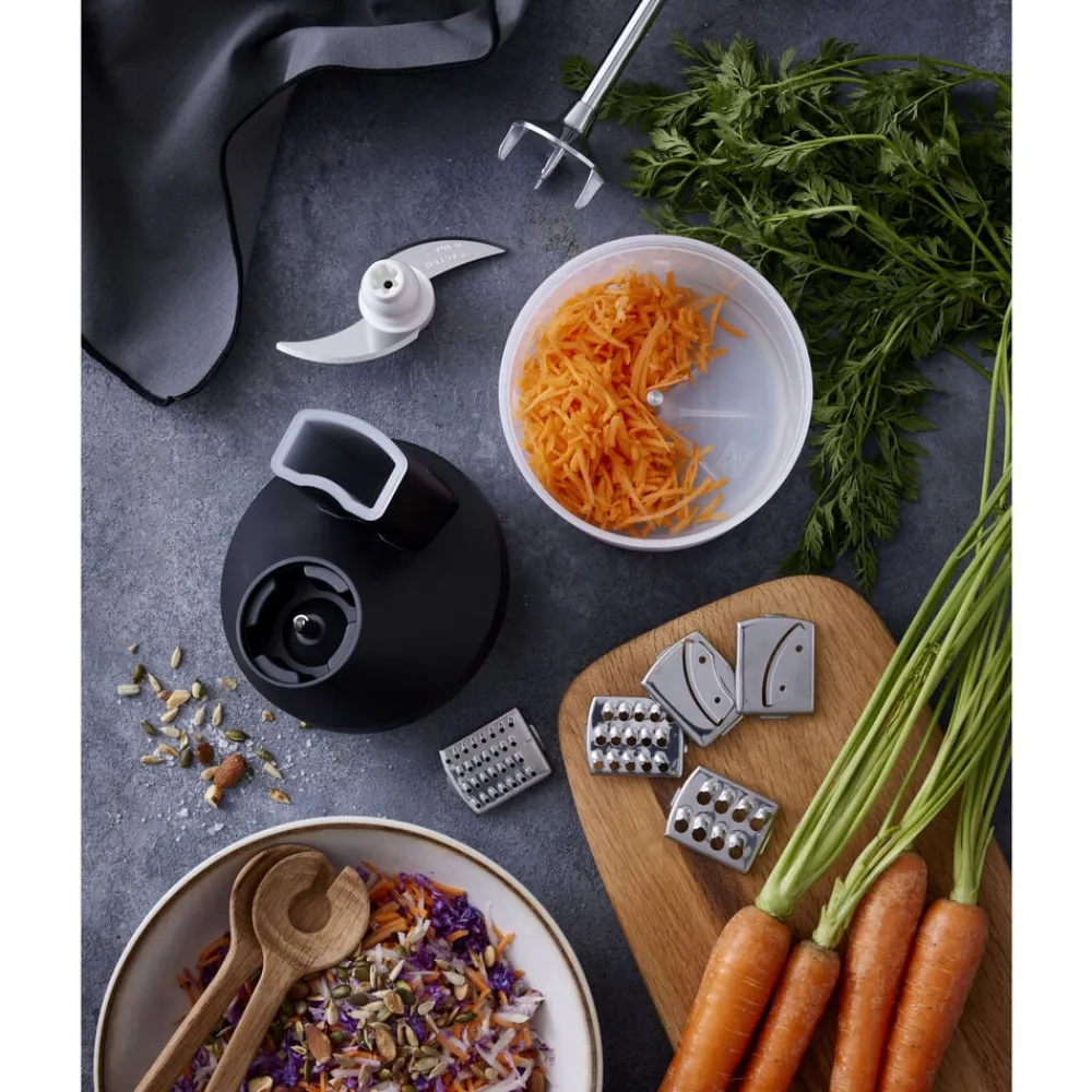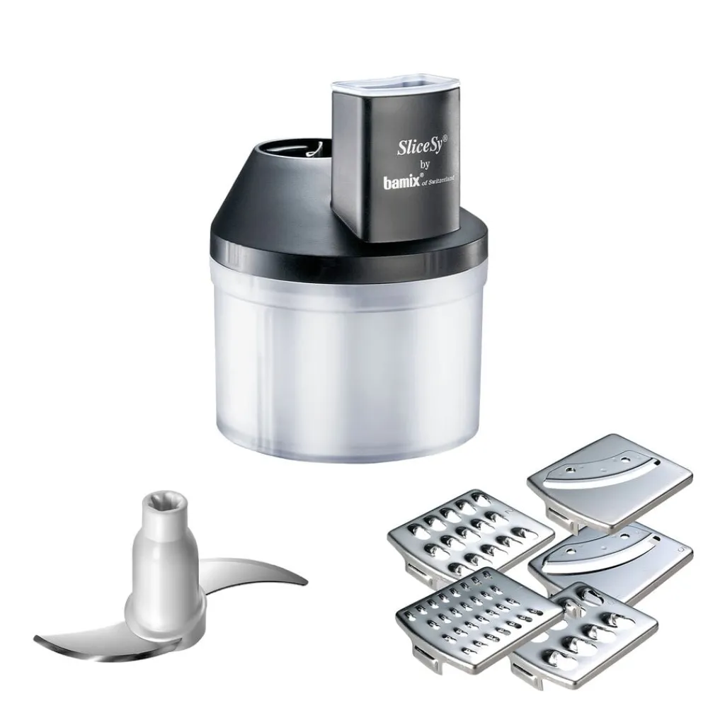 bamix®-tilbehør. SliceSy® til at hakke, rive, snitte og kværne – det hele klaret på den halve tid. Kan også bruges til at røre og blande dej. Produktet har en kapacitet på ca. 6 dl og leveres med 5 knivblade.