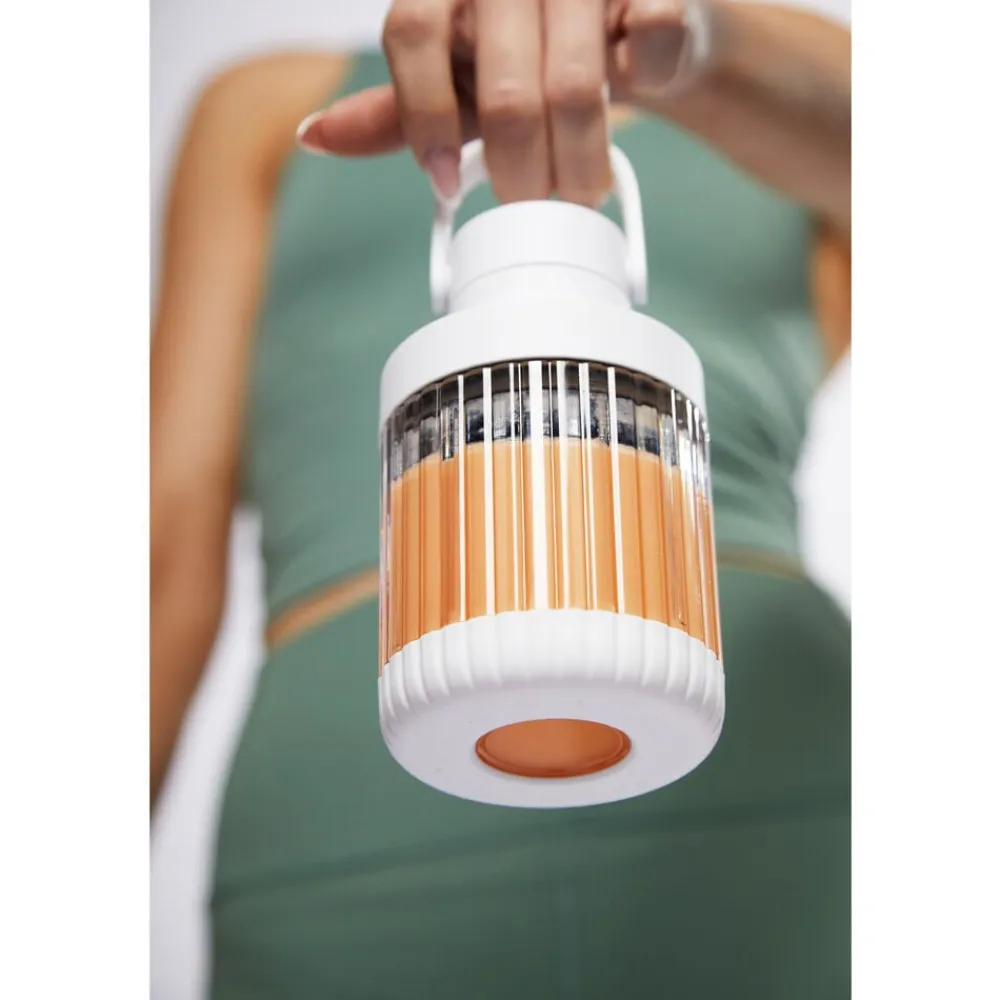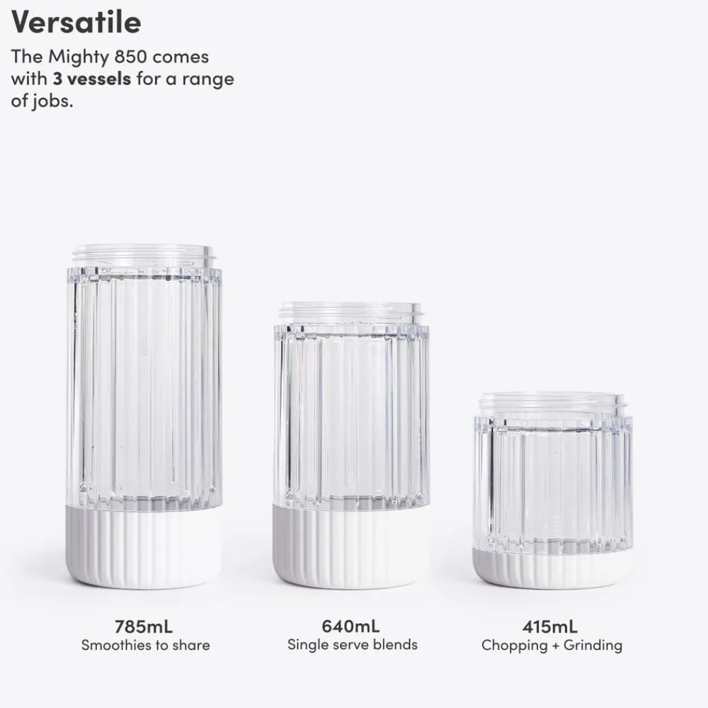 Beast Mighty Plus 850 leveres med tre blenderbeholdere (415, 638 og 786 ml), der fungerer som drikkebeholdere, når du sætter drikkelåg og sugerørshætte på og tager dem med dig på farten. Den rillede beholder giver dig et godt greb.