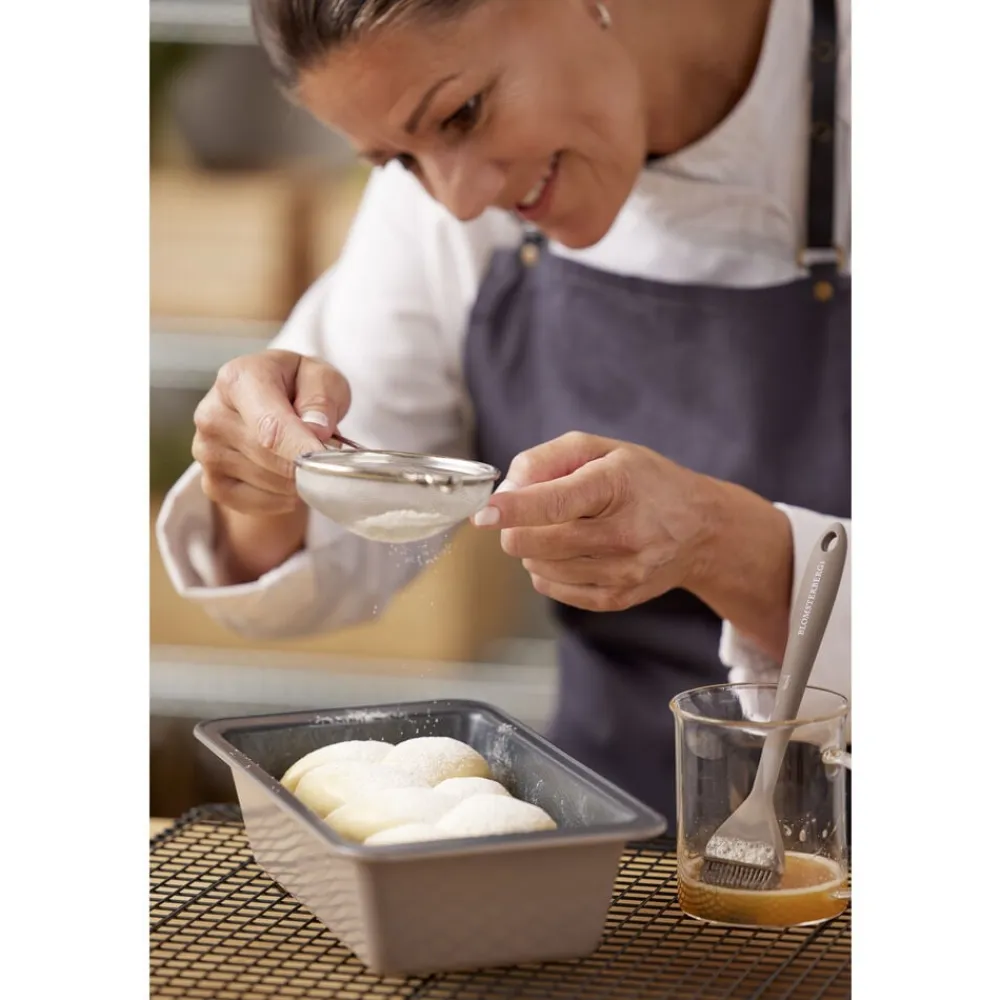 Brødform i ekstra kraftigt kvalitetsstål med en tykkelse på 0,5 mm og en praktisk non-stick-belægning, som får brød og kager til at slippe formen lettere. Designet er elegant med en smuk latte farve på udvendig side. Formen kan anvendes til fx rugbrød, franskbrød og andre spændende madbrød samt lækre rørekager, der kan glæde hele familien. Bør vaskes før brug første gang. Brødformen kan tåle temperaturer op til max 230 °C.