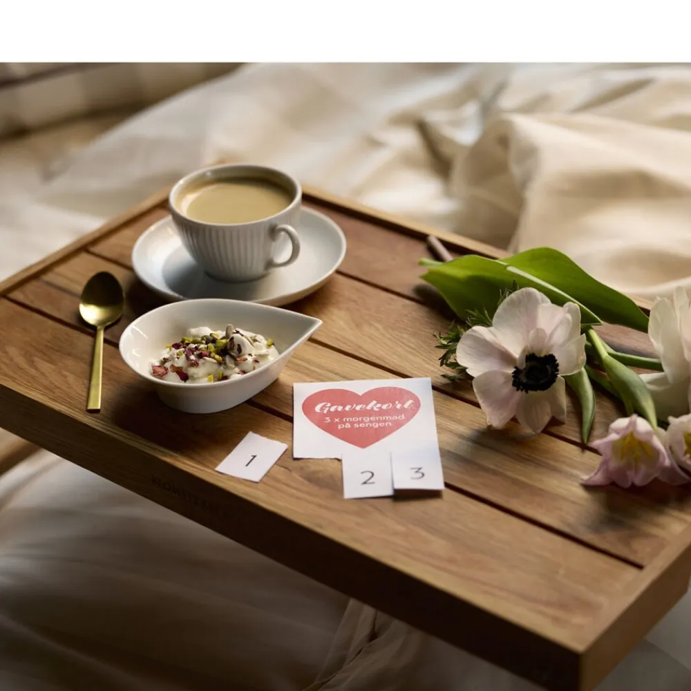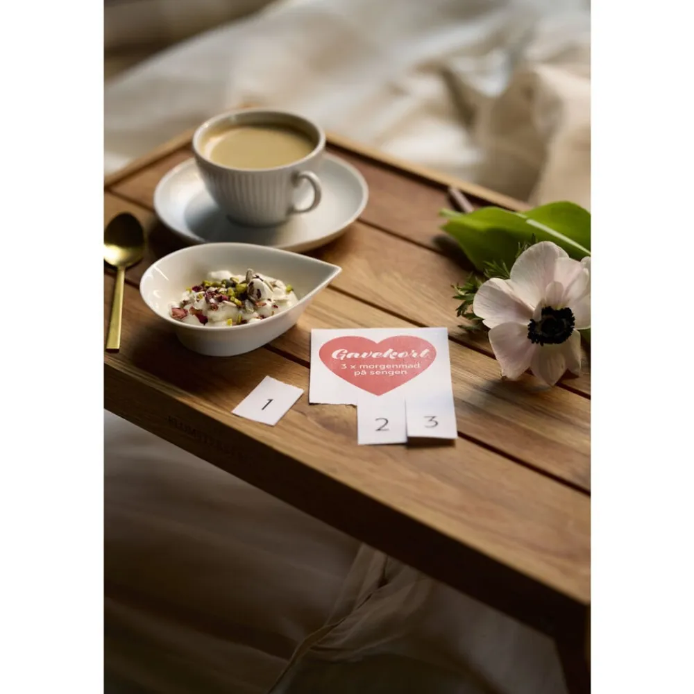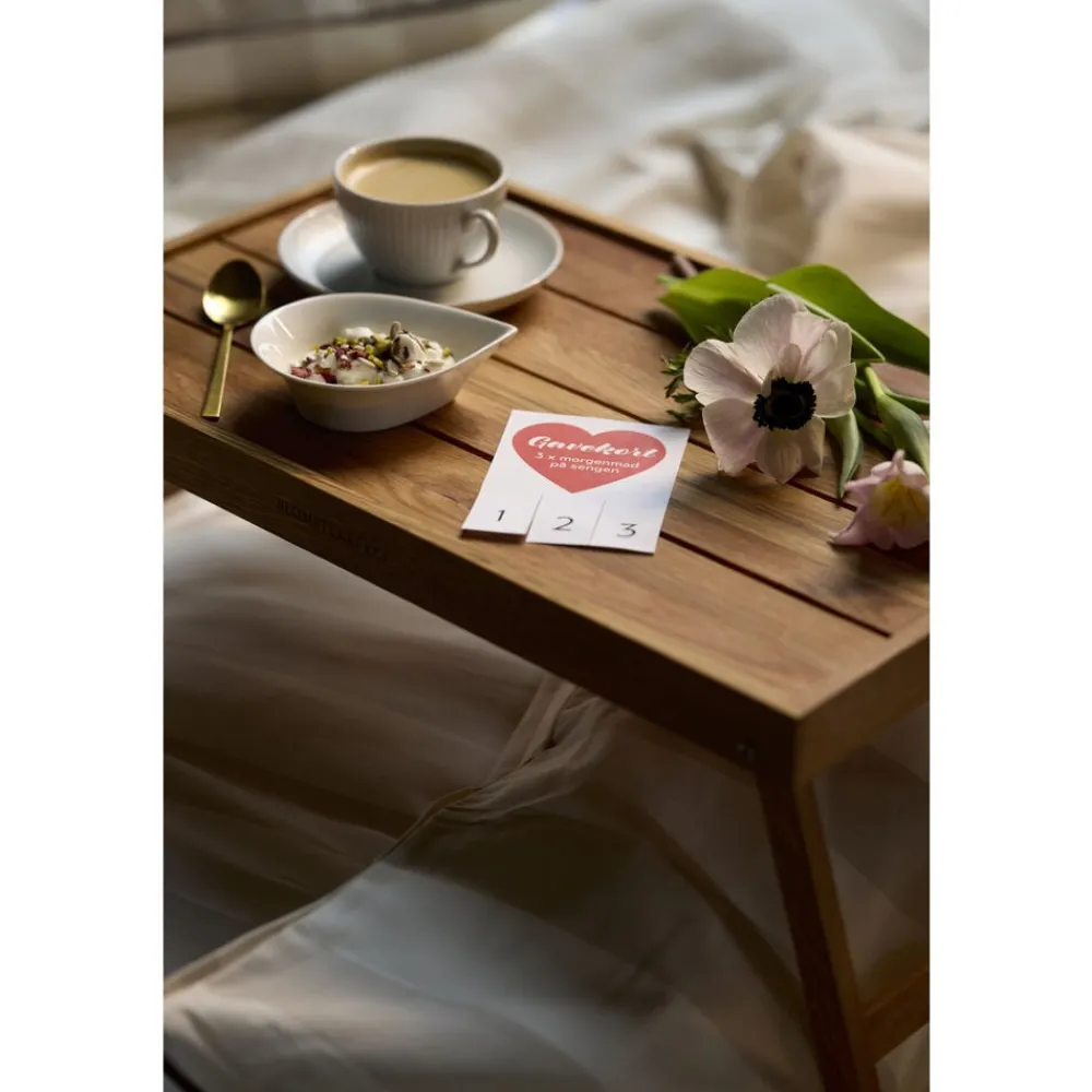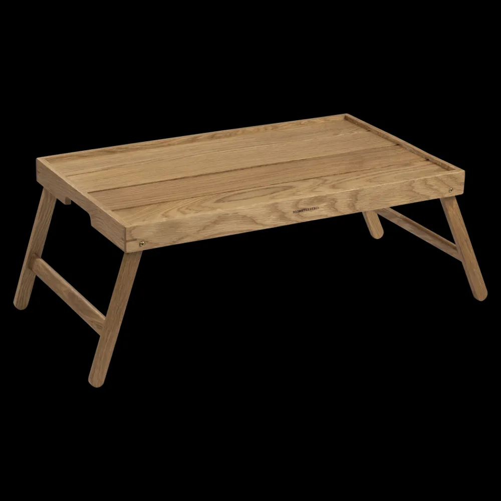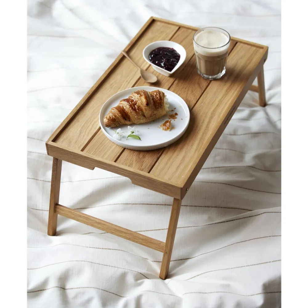 Serverings-/sengebakke med sammenklappelige ben. Server dejlig morgenmad på sengen eller nyd en afslappet stund i sofaen. Bakken aftørres med en fugtig klud og kan løbende vedligeholdes med madolie. Varen er produceret i FSC®-certificeret egetræ (FSC-C166612).