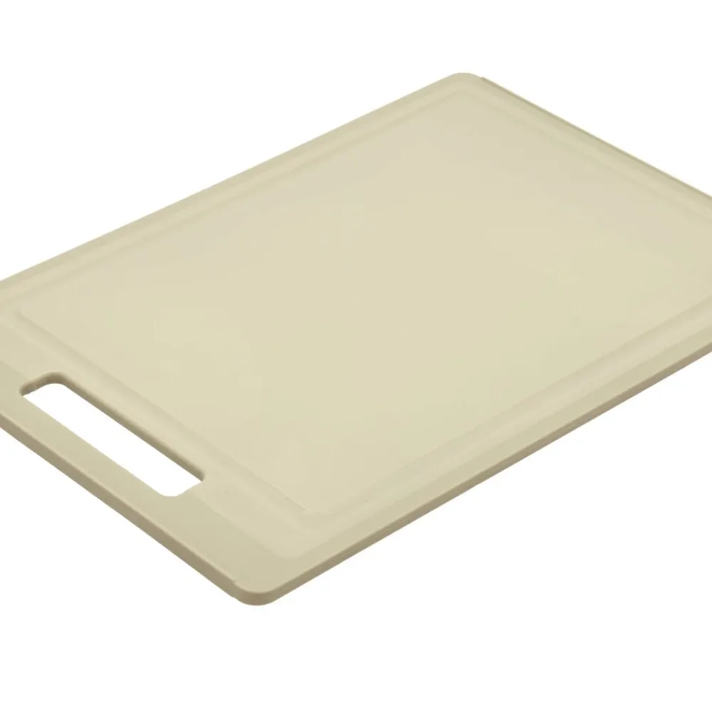 Funktionelt skærebræt i beige plast. Brættet har en bred saftrille på den ene side og er glat på den anden side, og begge sider af brættet kan derfor anvendes til forskellige skæreopgaver.
