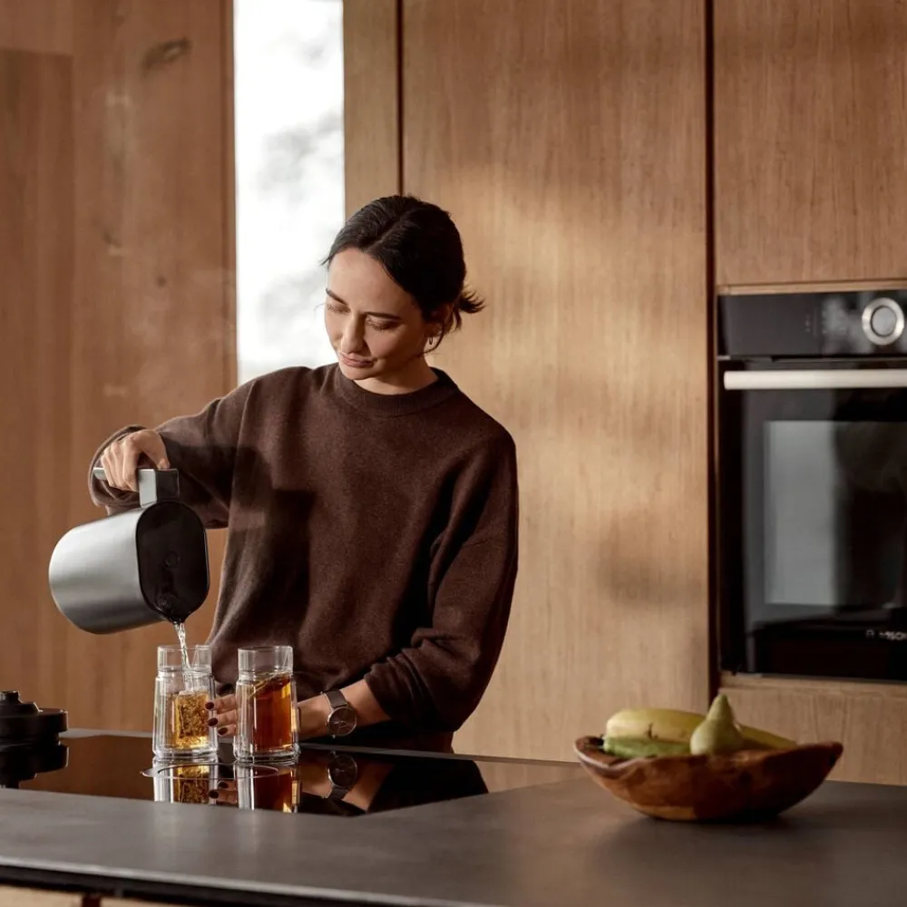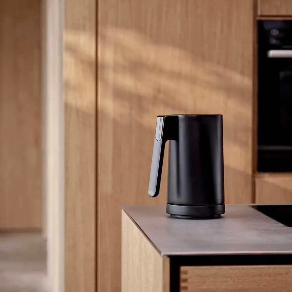 Jacob Jensen elkedel sætter en ny standard, når det gælder opvarmning af vand til din kaffe eller te. Den er fremstillet af solide materialer i en elegant form. Elkedlens display vækkes til live, når din hånd nærmer sig, og går i dvale, når kedlen ikke er i brug. Den har en kapacitet på 1,2 liter vand, og med syv forudindstillede temperaturindstillinger, der spænder fra 70 °C til 100 °C, kan temperaturen styres via touch displayet. Det digitale display gør det nemt at overvåge den aktuelle vandtemperatur, mens en blid tone signalerer, når dit vand har nået den ønskede temperatur. Derudover sikrer funktionen “Keep Warm”, at vandet bevarer den valgte temperatur, indtil kedlen fjernes fra basen.