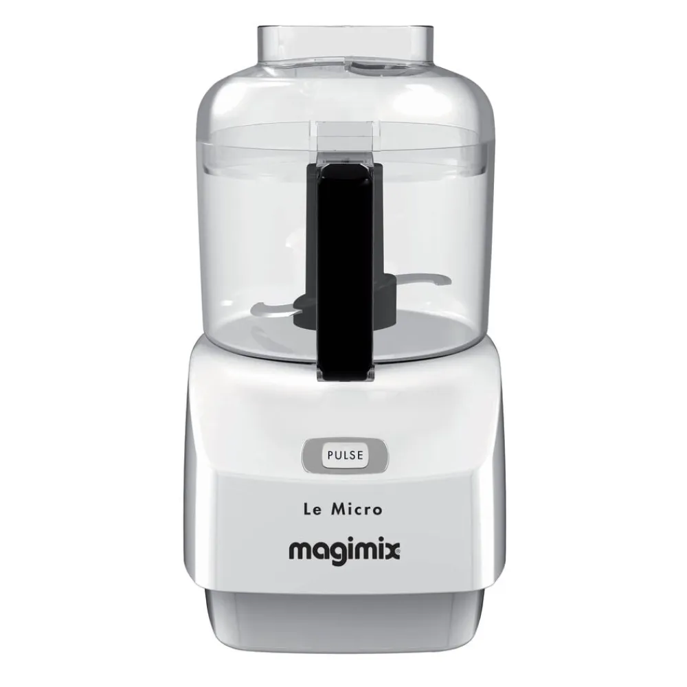 Magimix minihakker er effektiv, stilfuld og støjsvag. Den optager kun lidt plads på køkkenbordet og har et så flot design, at du gerne lader den stå fremme. Betjeningen er enkel. Låget har to åbninger til påfyldning af henholdsvis flydende og faste ingredienser, sættes let på og tages lige så nemt af. På fronten findes en enkelt knap til at aktivere både pulse-funktion og kontinuerlig kørsel, når knappen holdes nede.
