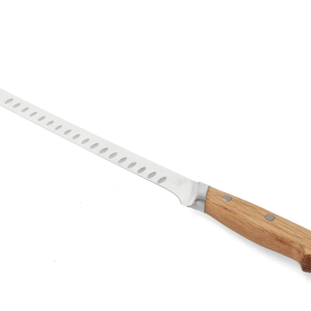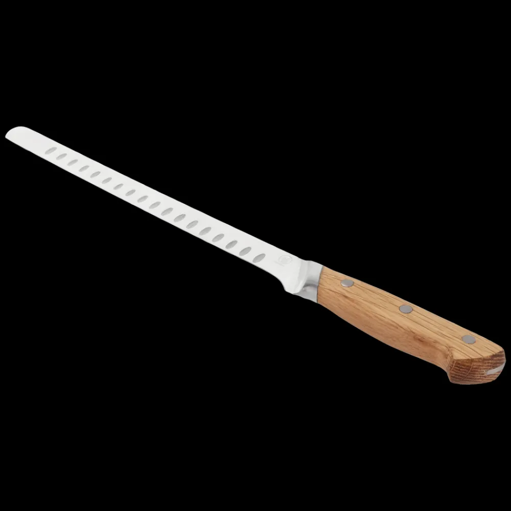 Knivbladet er udført i rustfrit kvalitetsstål og håndtaget i olieret eg, som ved brug vil udvikle patina og blot blive smukkere, jo mere kniven bruges. Træhåndtaget er udformet af ét stykke træ og er behageligt at holde om. Bladet er designet med luftskær, der sørger for, at fisken ikke sætter sig fast på bladet.