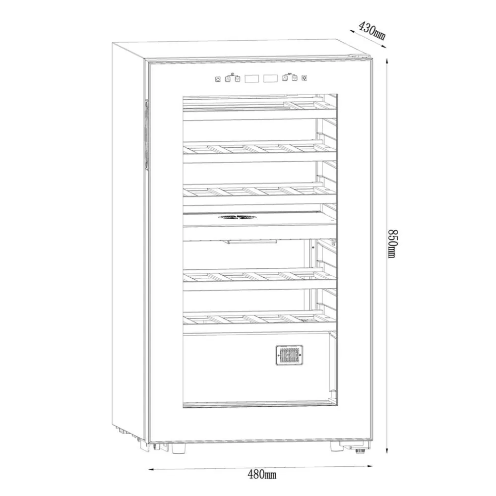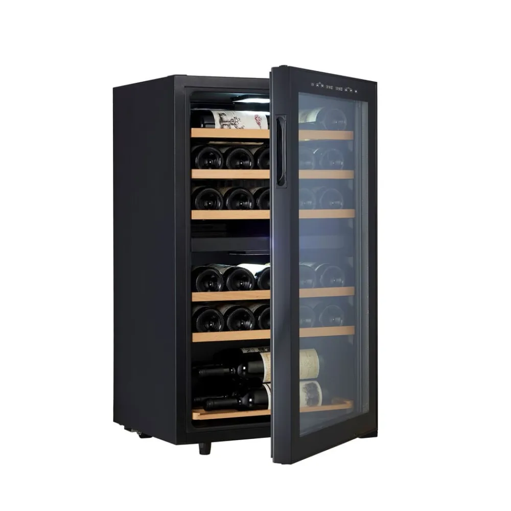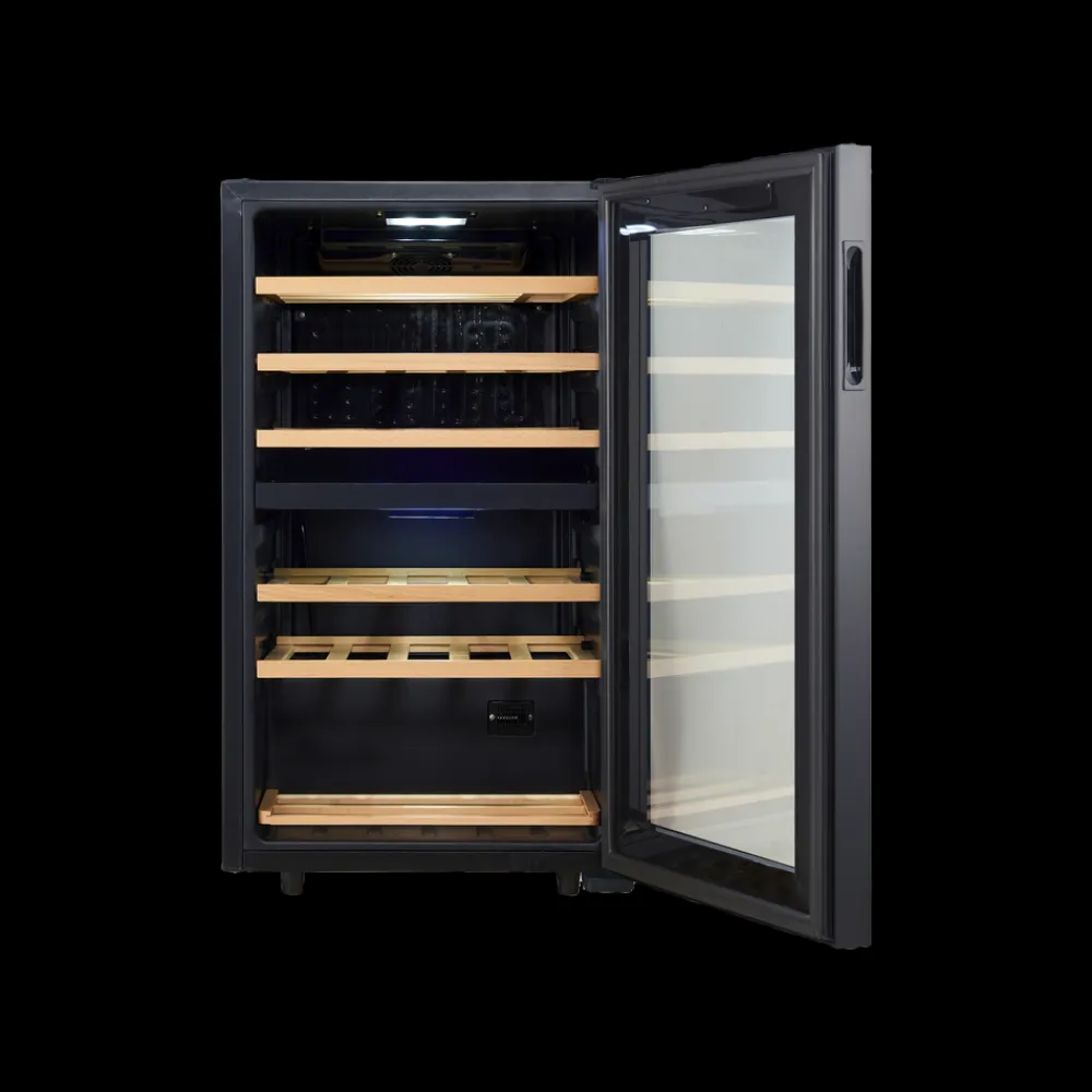 Vinkøleskabet er fritstående og kan placeres fleksibelt i hjemmet, for eksempel i køkkenet, stuen eller et vinrum. De udtrækkelige træhylder gør det nemt at få adgang til flaskerne og bidrager samtidig til et roligt og stilrent udtryk.