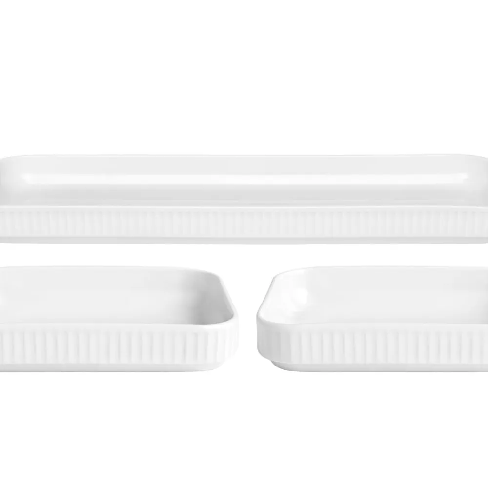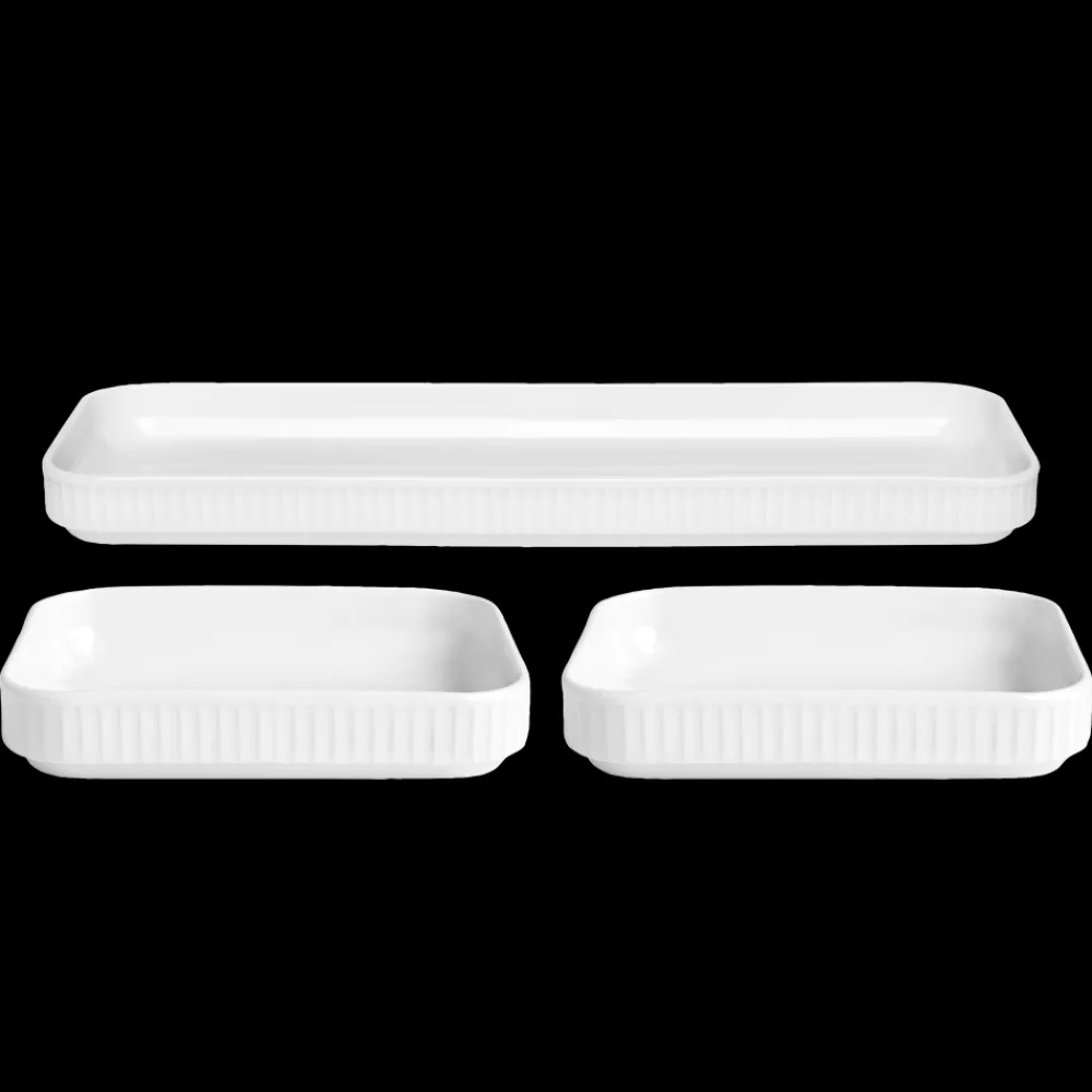 To Plissé tapasfade 18 x 12 cm og et fad 36 x 12 cm i hvid ovnfast porcelæn til servering af kolde og varme retter.