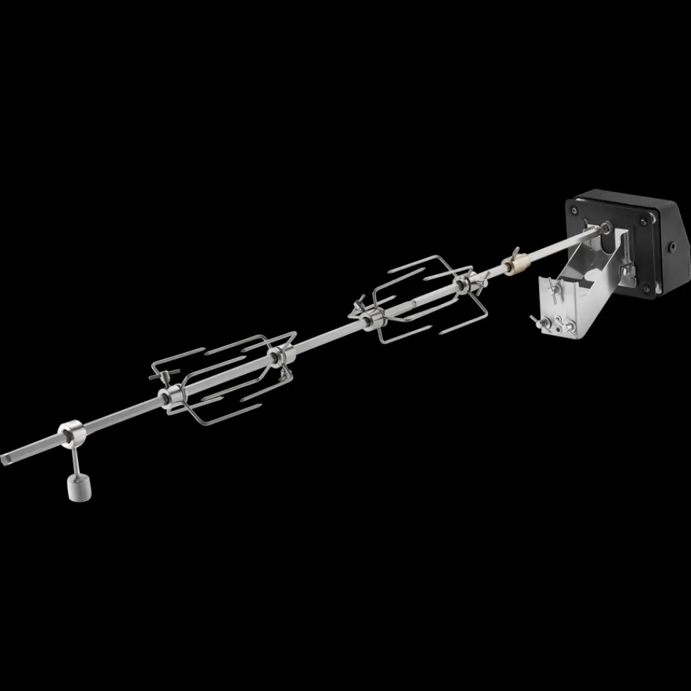 Rotisserie med ca. tre omdrejninger pr. minut, som sikrer sprødt kød udenpå og saftigt indeni. Det solide spyd i rustfrit stål kan klare op til 10 kg og er udstyret med fire holdere til sikker fastgørelse af kødet. Leveres med elmotor (230 V / 50 Hz) og passer til alle AllFlame-modeller fra Rösle.