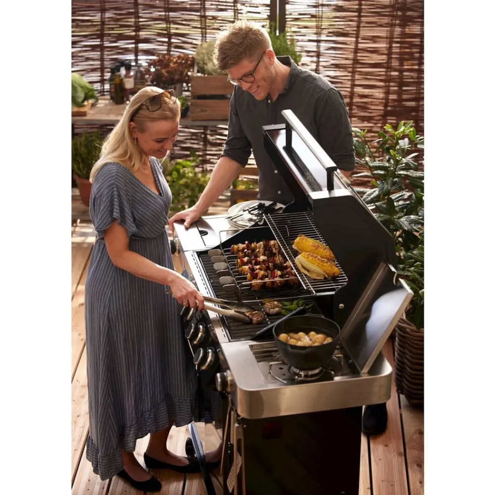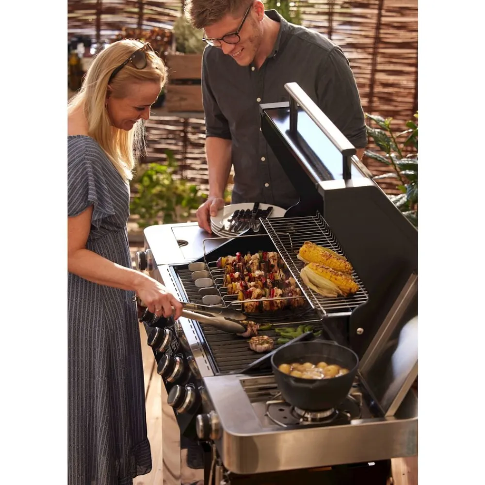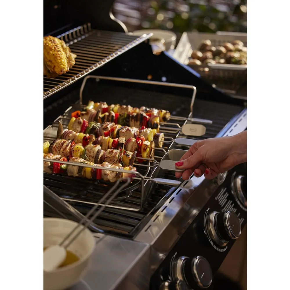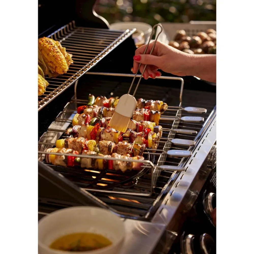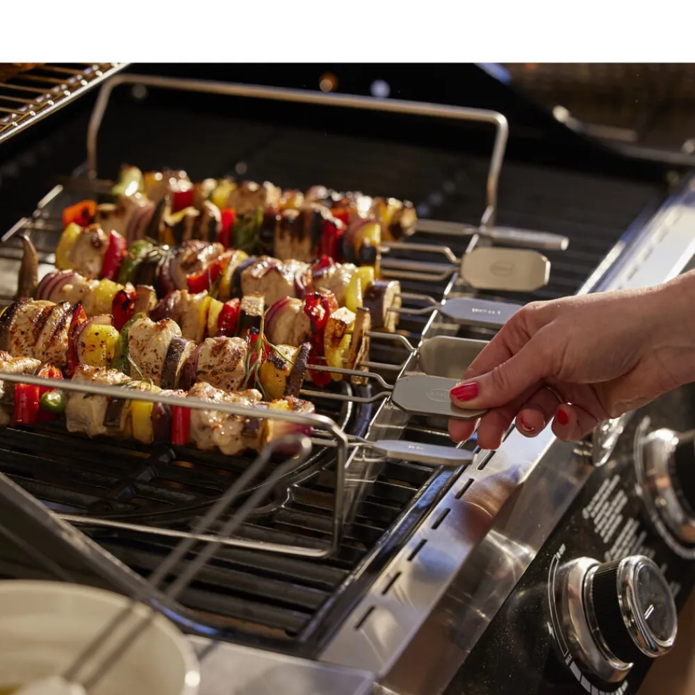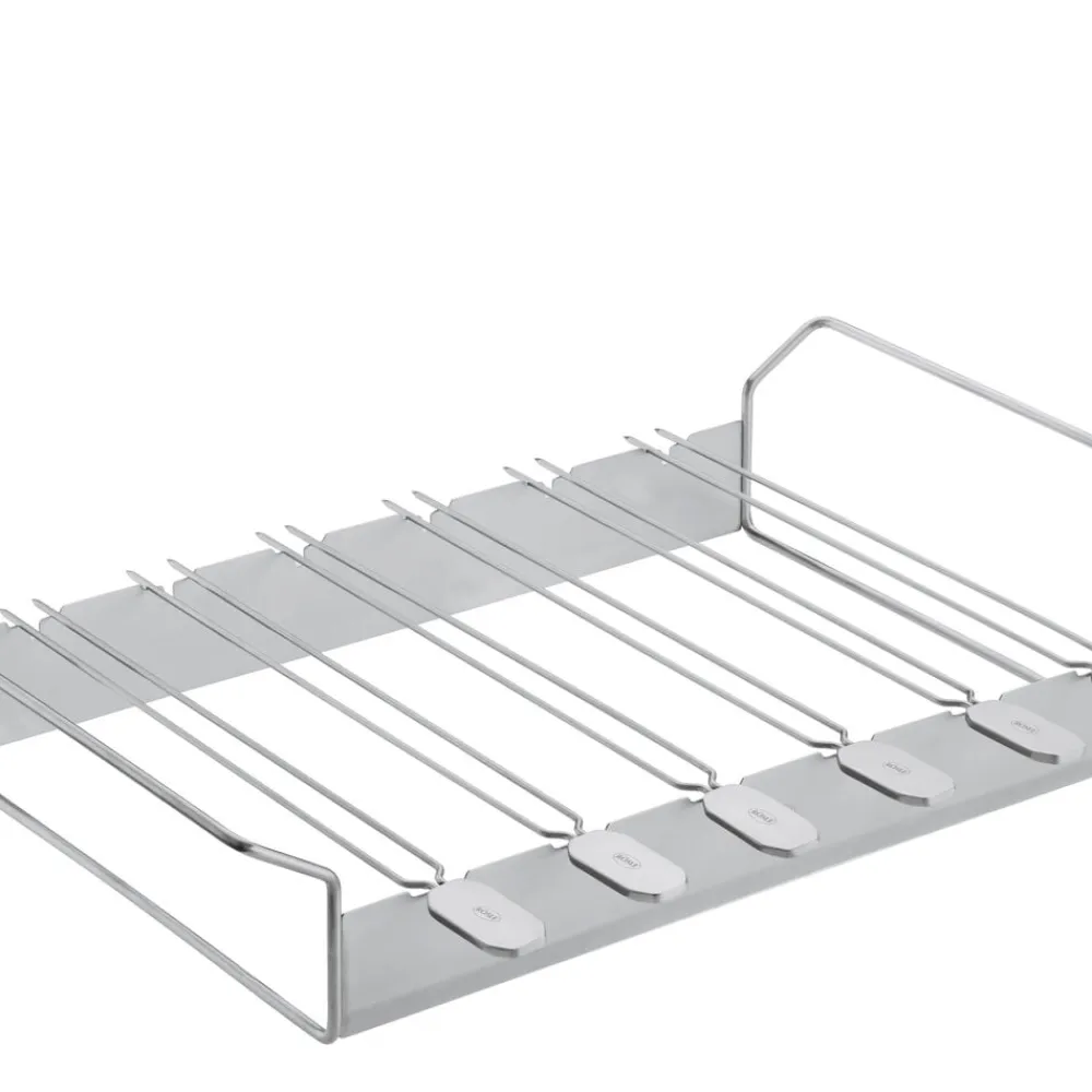 Sæt med 6 spyd og et stativ. Spyddene kan drejes og holdes i 4 positioner for at sikre all-round grillning. Dobbeltspidser forhindrer maden i at glide, når den drejes. Ideel til at holde mindre madvarer. Længde på hvert spyd er ca. 33 cm. Velegnet til kedelgrill 60 cm. Kan også bruges på gasgrill, så længe dybden på kogekammeret er 30 cm.