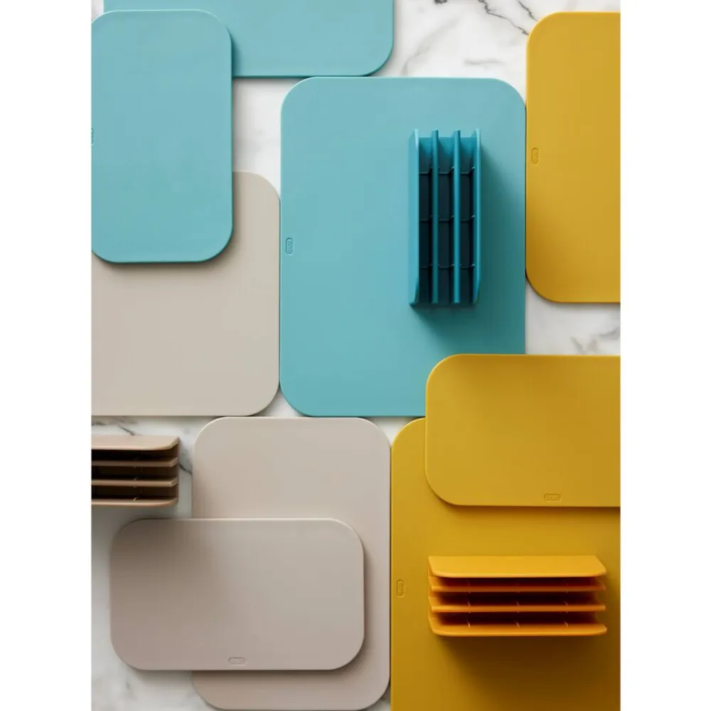 Til serien fås en smart holder med fokus på både opbevaring og hygiejne. Den holder skærebrætterne samlet, uden at de optager meget plads på køkkenbordet, og er udformet, så du kan sætte et fugtigt skærebræt direkte i holderen. Skærebrætterne står nemlig med lidt afstand til hinanden, og i bunden af holderen er der riller, som sikrer god ventilation og dermed hygiejne, f.eks. hvis brættet stadig er fugtigt, når det sættes på plads. Brætterne kan vaskes i opvaskemaskine.