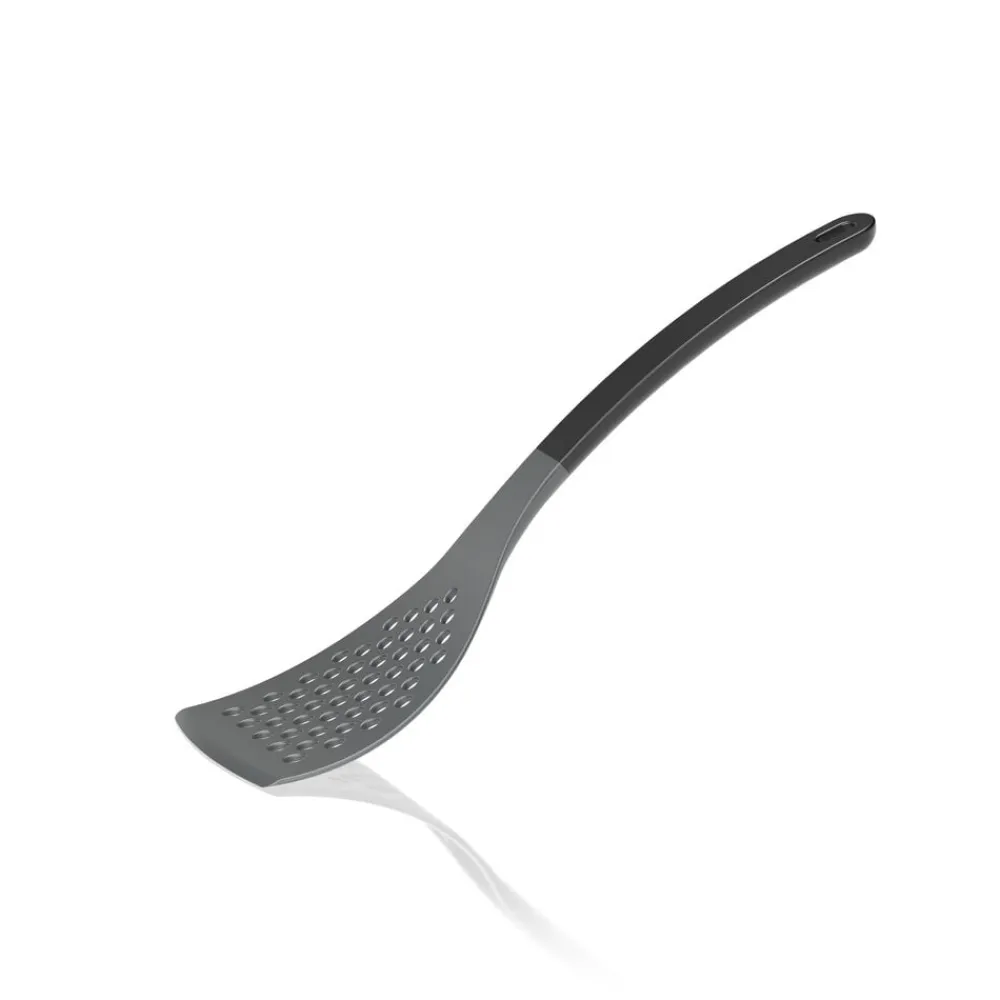 Stor palet med farvet skaft. 31 cm. Bladet er perforeret, og med en bredde på 8,5 cm er paletten velegnet til at håndtere større fødevarer på panden, såvel kød som grøntsager. Fremstillet i nylon, der er skånsomt mod gryder og pander med belægning og tåler varme op til 220 grader C. Slankt og ergonomisk design med praktisk ophængshul. Velegnet til opvaskemaskine.