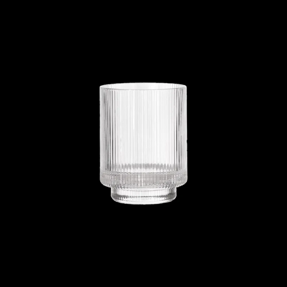 Clarity sæbedispenseren og tandbørsteholderen er lavet af riflet glas med et diskret bølgemønster. Den slanke silhuet giver et cool og elegant look.