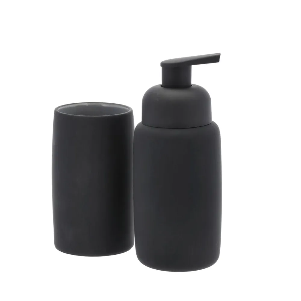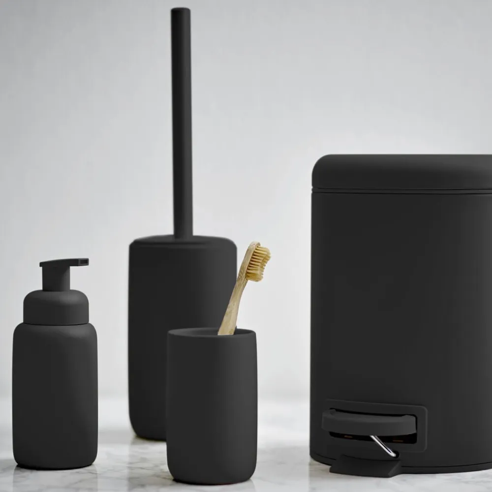 Södahls matte badserie har soft rubbercoating all over, også på sæbedispensertud og toiletbørsteskaft. Kruset er med lækker kontrastfarvet, blank glasur indvendigt.