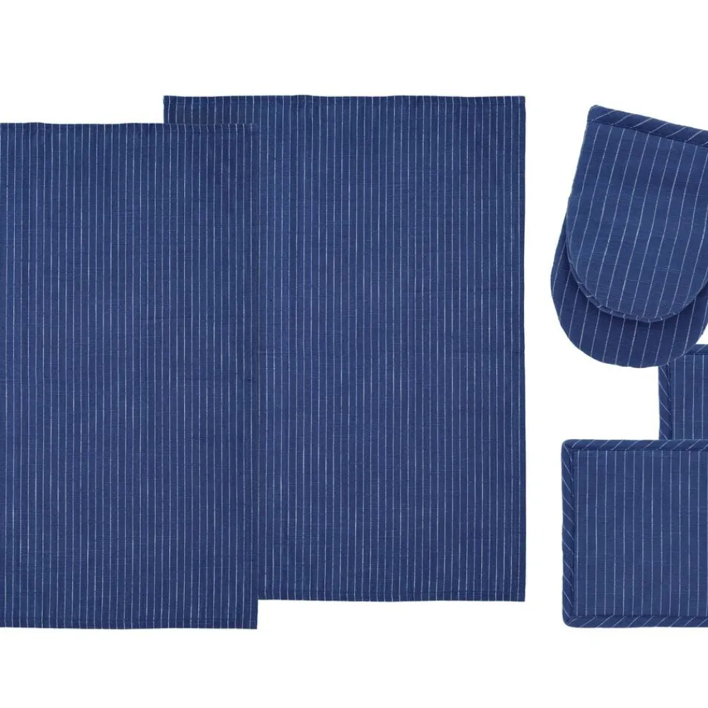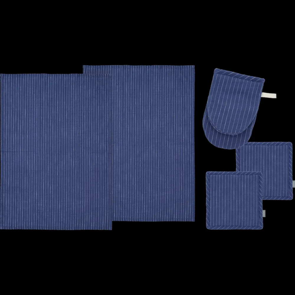 Tekstilsættet i 5 dele i økologisk bomuld består af 2 viskestykker 50 x 70 cm, miniovnhandske 14 x 21 cm og 2 grydelapper 20 x 20 cm.