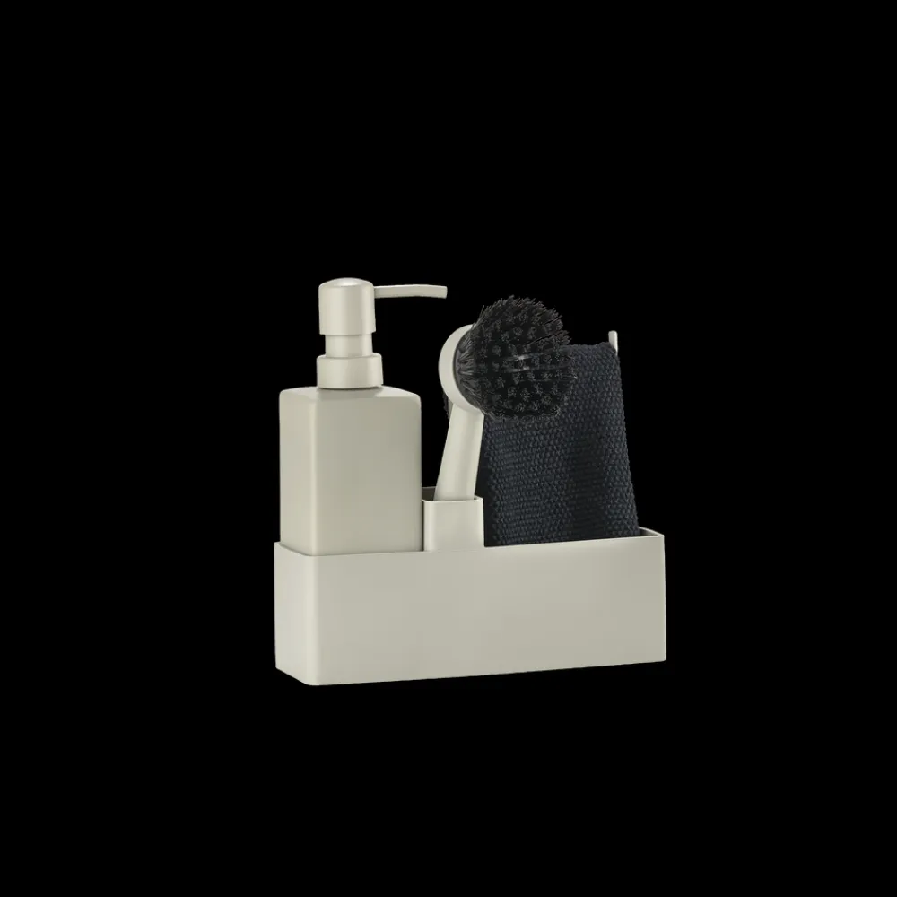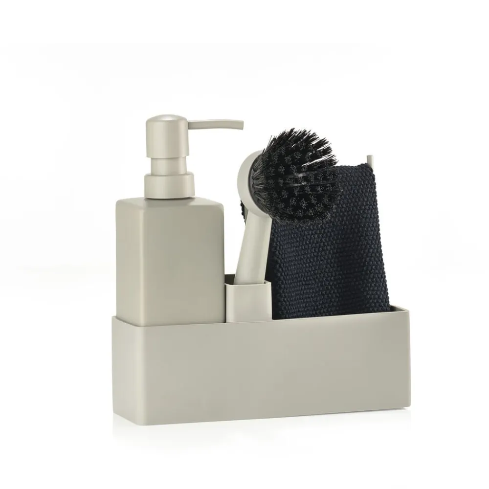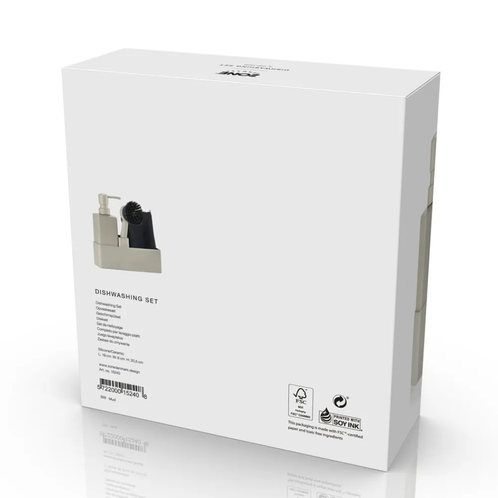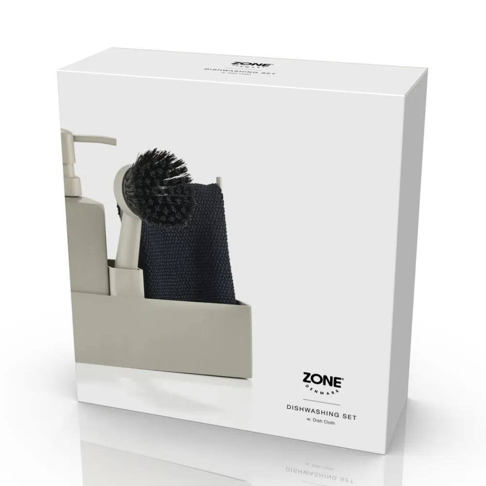 Zones populære alt-i-ét opvaskesæt med karklud. Sæbedispenseren er fremstillet i solid keramik, og opbevaringsdelen er i ridsefri og rengøringsvenlig silikone. Børsten kan stå selv, og børstehovedet kan udskiftes, så du altid har en frisk børste.