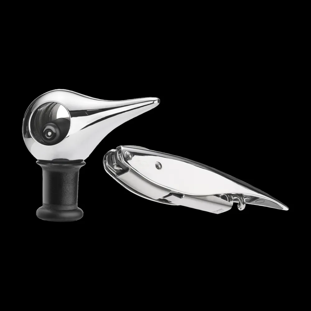 Zones elegante vinsæt består af Bird vinprop og Feather proptrækker. Feather er en lækker fortolkning af tjenerværktøjet, en klassiker i ny fjerdragt. Feather har indbygget folieskærer og oplukker, og den bøjelige arm gør det let at åbne flasken i to trin uden at bruge mange kræfter. Kan let foldes sammen og tages med på fx picnic. Det elegante figurative design i vinproppen Bird har en genial funktion. Sæt proppen i din åbne vin, vip fuglens næb til modsatte side og få en helt tætlukket flaske. Den kan ovenikøbet ligge ned i køleskabet, til du igen får lyst til et glas. Design: Mencke og Vagnby.