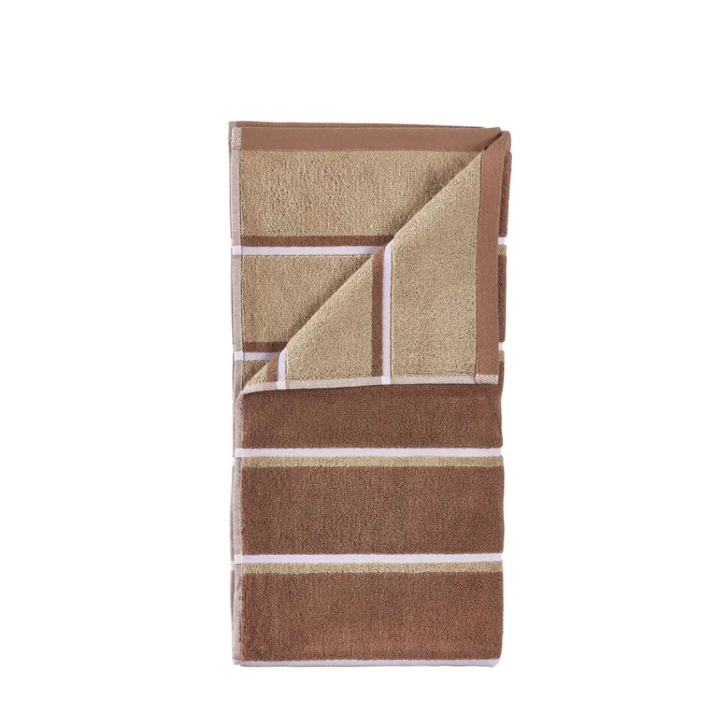 De retroinspirerede striber tilføjer et grafisk, urbant touch, og med en blød, kraftig kvalitet i garnfarvet 600 grams bomuld, føles håndklædet lige så lækkert, som det ser ud.