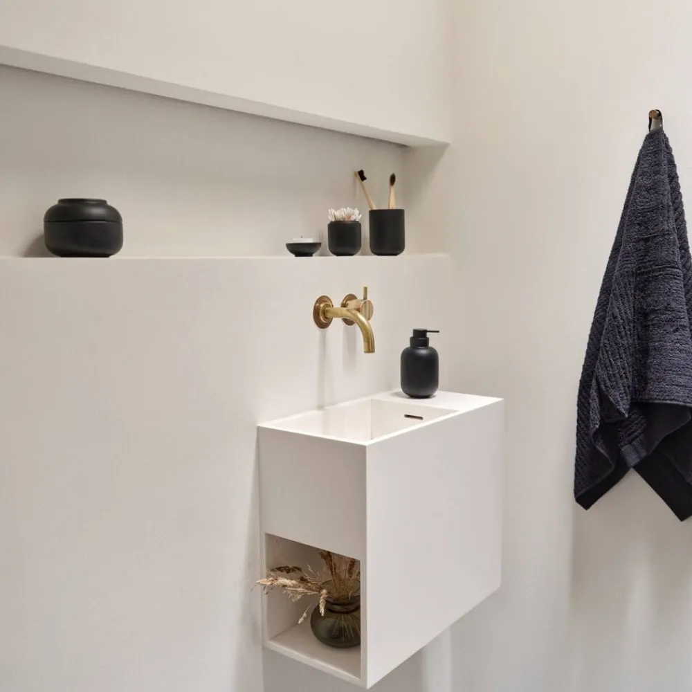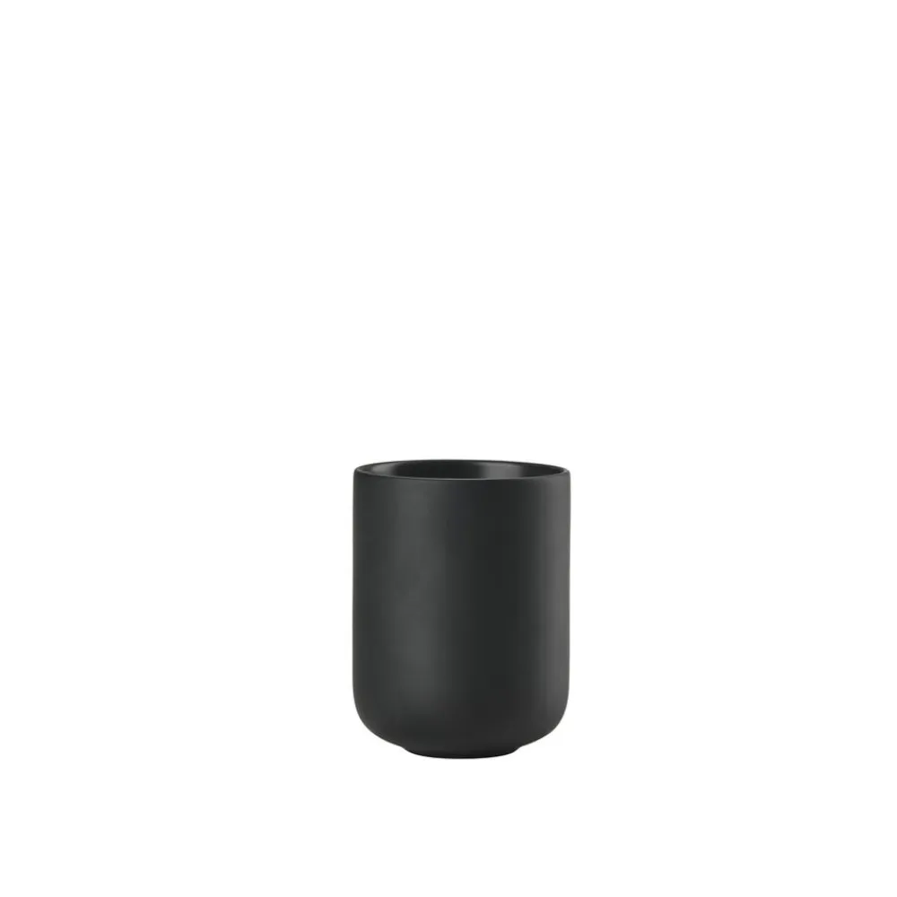 Ved vasken finder du en sød cylinderformet sæbedispenser med et fint lille pumpehoved. Den matcher det klassiske tandbørstekrus, der, ligesom seriens øvrige designs, er udført i stentøj. Takket være stentøjets tyngde og den runde bund står tandbørstekruset sikkert på bordet. Køb evt. flere og brug et af dem til make-up-børster, barbergrej eller andre hverdagsfavoritter, der skal være inden for rækkevidde.