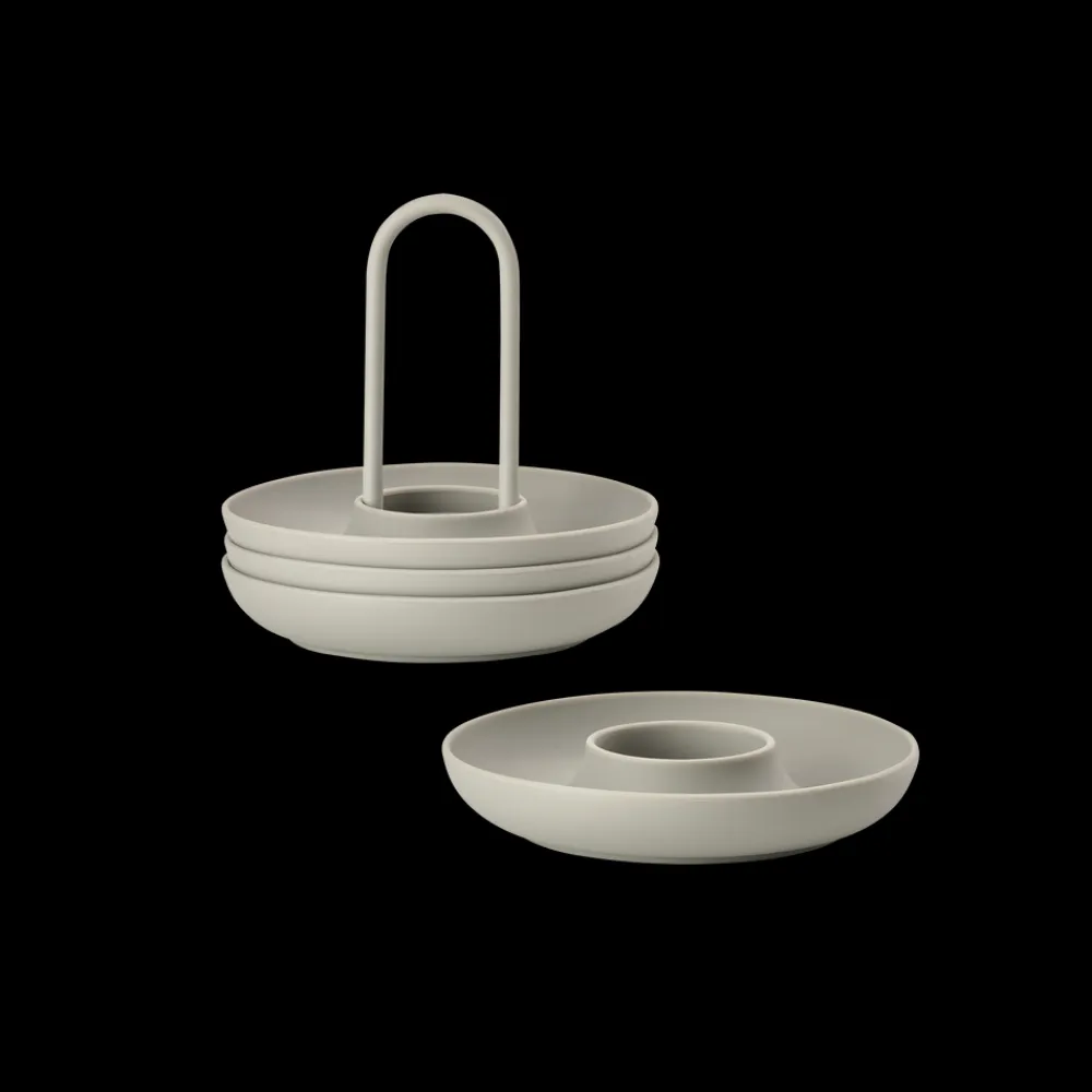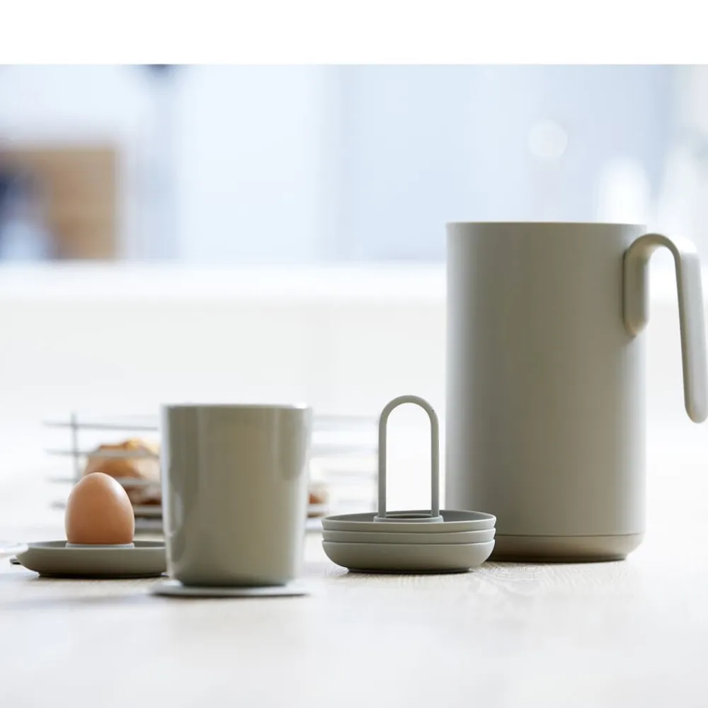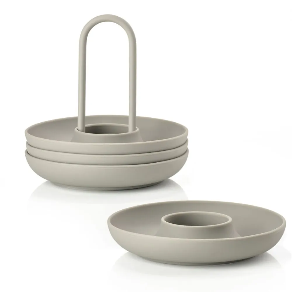 De fire æggebægre i holder fra Singles kan sættes på bordet med kun én hånd. Og den buede kant fanger både salt, æggeskaller og gæsternes opmærksomhed. Så kan du spise brunch med stil – fx i selskab med gode venner.