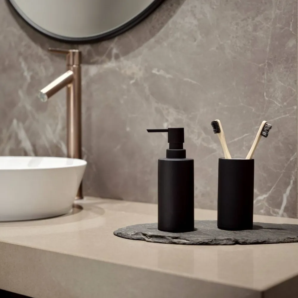 Med Solo badserie er der helt rene linjer. Produkterne er samtidig holdt i rene farver og står rent, flot og funktionelt i badeværelset. Sæbedispenseren rummer 0,3 l og matcher tandbørstekrus, toiletbørste og pedalspand perfekt.