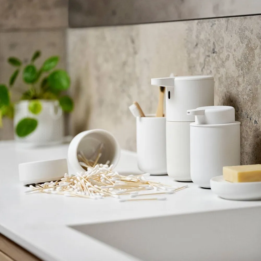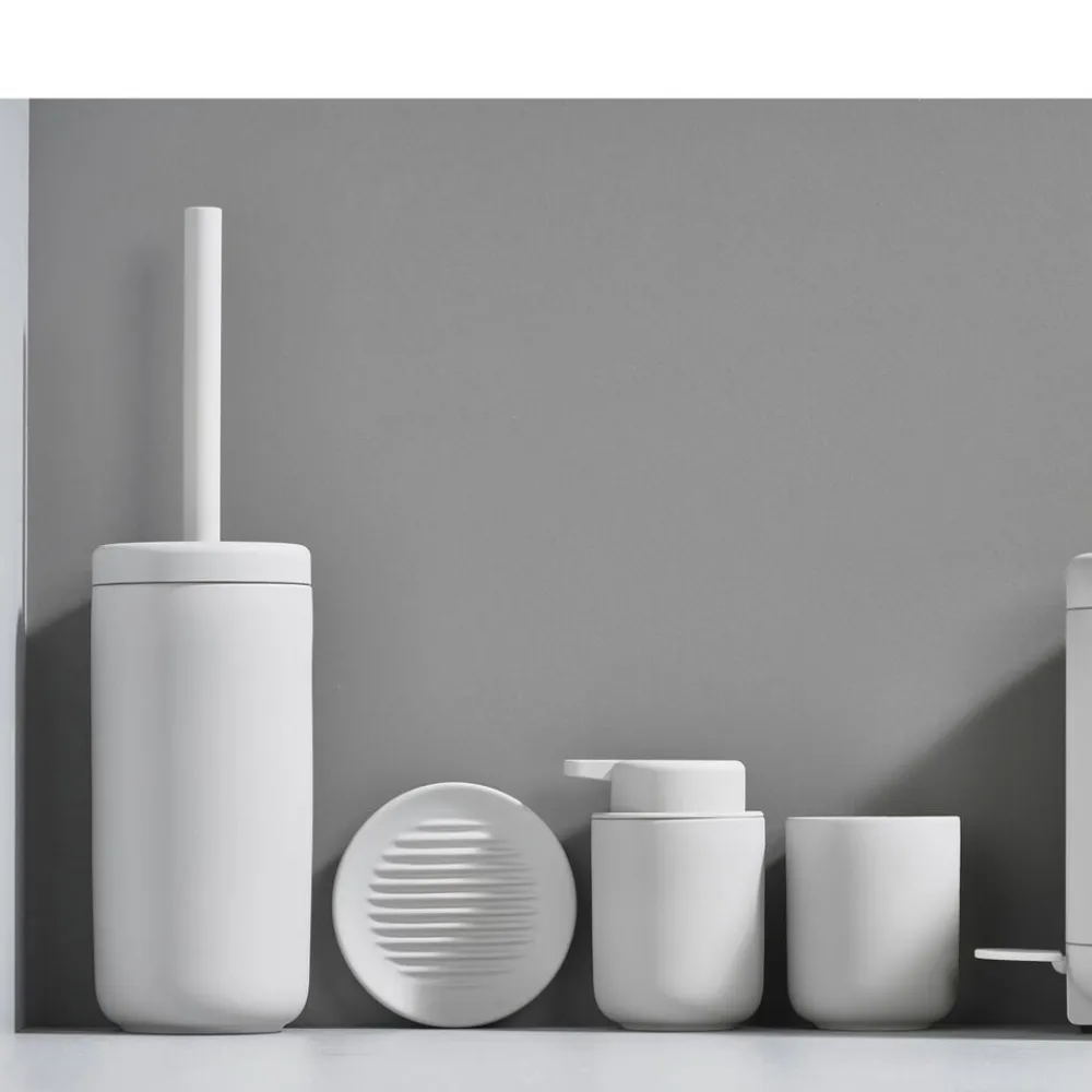 Sæbedispenseren har eksempelvis en lang tud for optimal pumpefunktion, ligesom toiletbørsten er udstyret med en praktisk inderkop, så overskydende vand let kan tømmes af – og så har børsten en god arbejdslængde og glider let på plads i holderen.