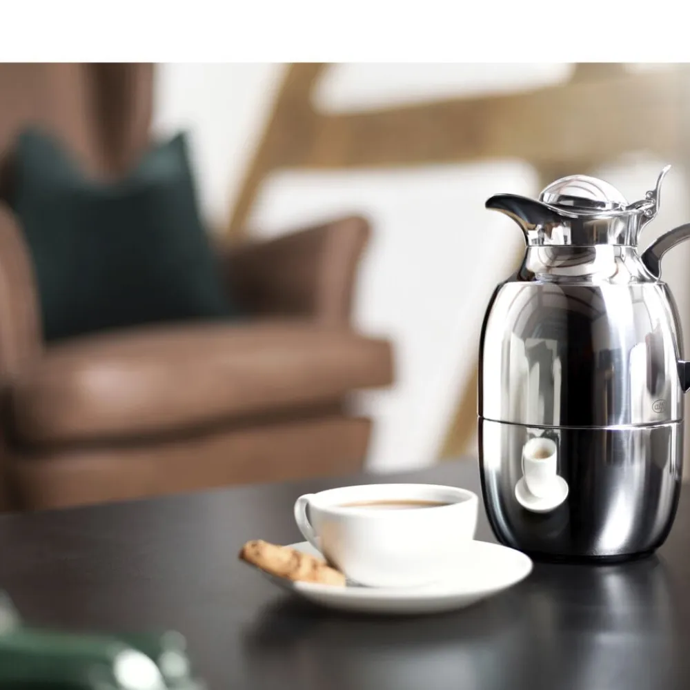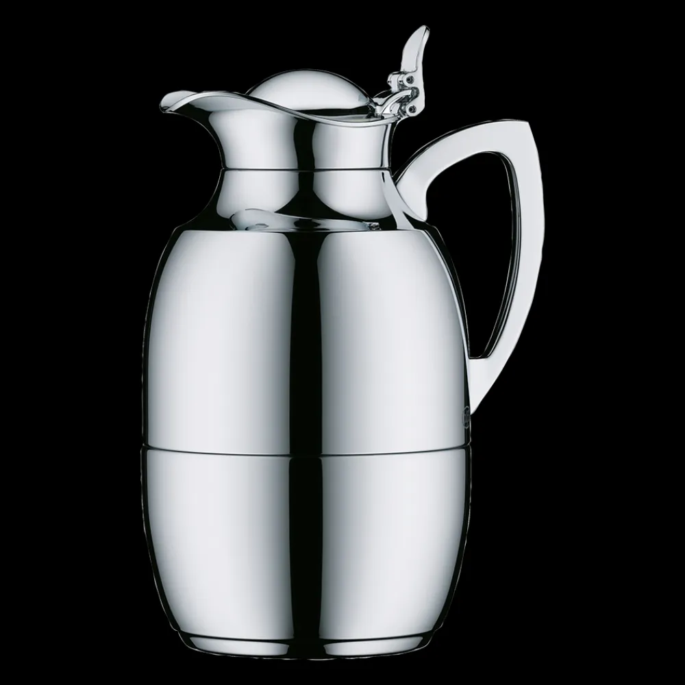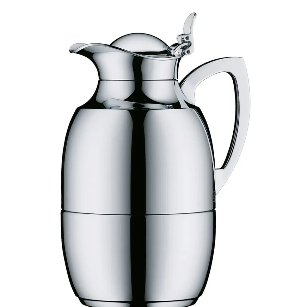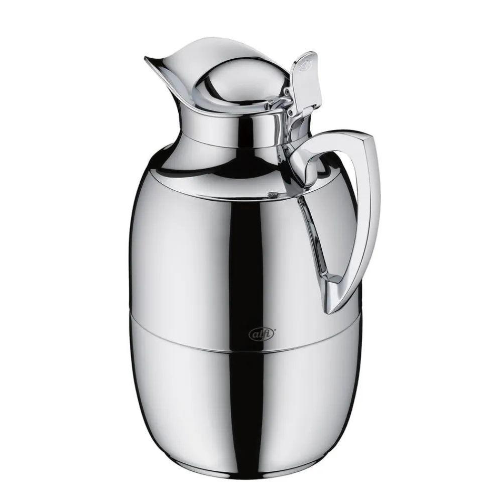 Alfi Juwel er en af verdens mest kendte termokander, og det oprindelige stilrene design kan dateres helt tilbage til 1918. Termokande i poleret stål i høj kvalitet. Dobbeltvægget AlfiDur-indsats i isolerende og hærdet vakuum-glas. Holder varmt i 12 timer, holder koldt i 24 timer. Unikt og praktisk hældesystem. Kan betjenes med én hånd. Ergonomisk, forkromet metalhåndtag.