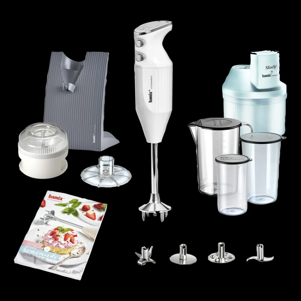 bamix® Baking-stavblender med en kraftig 200 watt motor, der sikrer pålidelig hjælp til selv de hårdeste opgaver i køkkenet. Stavblenderen har to hastighedsindstillinger og en praktisk spiralledning, der giver masser af fleksibilitet. Til produktet medfølger multifunktionskniv, blenderskive, piskeskive, kød- og grøntsagskniv, processor, pulverskive, mixebægere med låg 400, 600 og 1000 ml, SliceSy®, bordstander og opskriftsbog med masser af bageopskrifter samt en instruktionsmanual. Livstidsgaranti på motor.