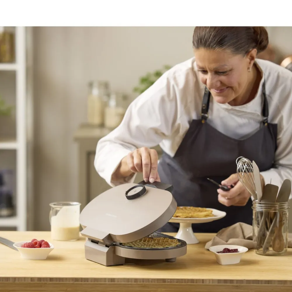 Giv morgenbordet eller eftermiddagshyggen et ekstra skud kærlighed med hjerteformede vafler, der vækker begejstring hos både store og små. Dobbelt vaffeljern med to plader, hver med en diameter på 15,5 cm, og en non-stick-belægning, som får dine vafler til at slippe nemt – og den keramiske belægning er fremstillet af råvarer, der ikke indeholder PFAS. Med justerbar temperatur, lysindikator og en smart dampventilering, som sikrer, at hver vaffel får den helt rigtige sprødhed.